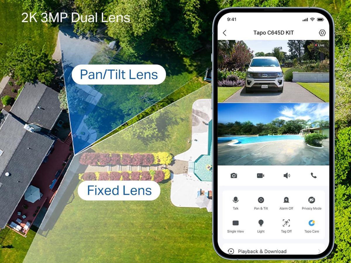 La C645D de Tapo est équipée d'un objectif fixe 2K supérieur avec un champ de vision (FOV) de 165°, et d'un téléobjectif 2K inférieur avec fonction panoramique/inclinaison, qui peut suivre automatiquement les objets en mouvement jusqu'à 360° à l'horizontale et 120° à la verticale. La caméra de sécurité intelligente peut identifier les personnes, les véhicules et les animaux domestiques, une fonction qui ne nécessite pas d'abonnement. D'autres fonctions incluent la vision nocturne en couleur et des zones d'activité ou de confidentialité personnalisables.