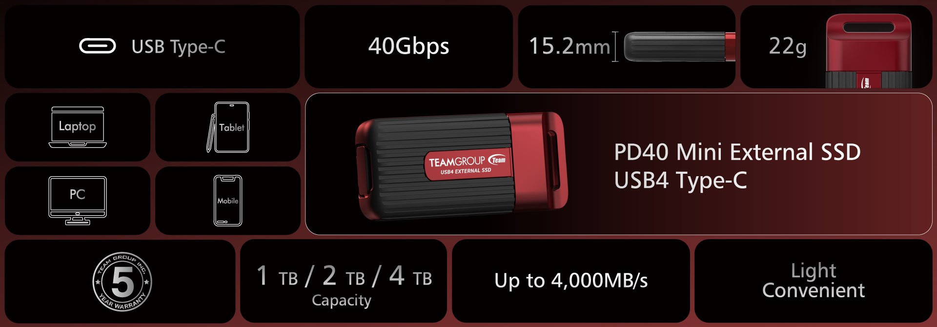 Team Group a présenté un nouveau disque de stockage portable, le PD40 Mini External SSD. Il est livré avec une connectivité USB4, mais est également compatible avec les périphériques USB 3.2 et USB 2.0. Néanmoins, avec le port Type-C plus rapide, la société affirme qu'il peut offrir des vitesses de lecture allant jusqu'à 4 000 Mo/s.