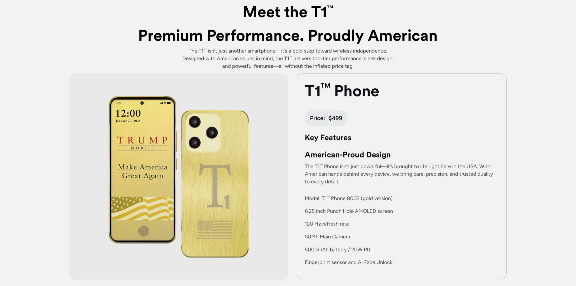 Le téléphone T1 de Trump a été dévoilé à la mi-juin 2025. Proposé au prix de 499 dollars, ce smartphone de milieu de gamme offre des caractéristiques plus proches de celles des appareils d'entrée de gamme beaucoup moins chers. Les précommandes ont commencé peu après l'annonce, les premiers acheteurs devant verser un acompte de 100 dollars. Deux semaines seulement après son lancement, Trump Mobile avait déjà modifié ses spécifications et confirmé qu'il n'était pas "Made in USA" comme annoncé à l'origine.