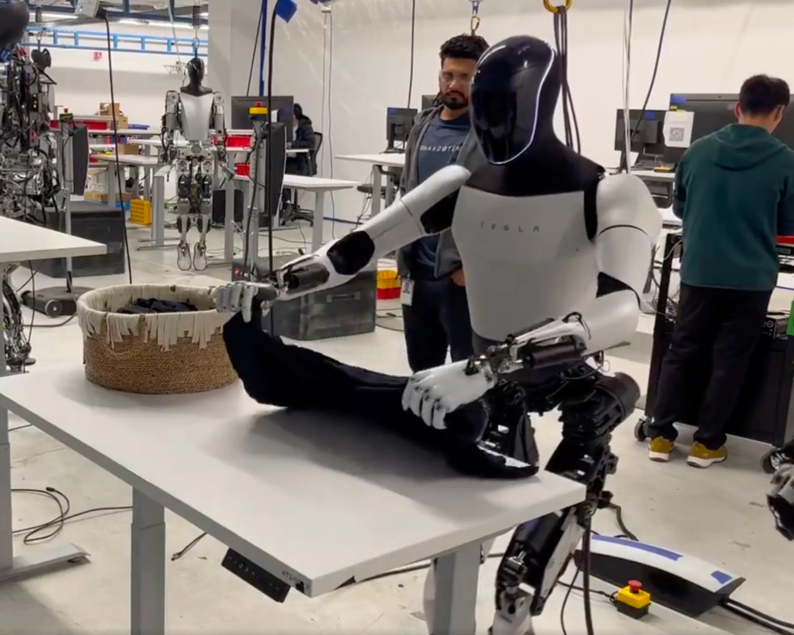 Dans la dernière vidéo publiée sur X (anciennement Twitter), on peut voir Optimus Gen 2 prendre un T-shirt dans un panier, le placer soigneusement sur une table, puis plier le vêtement avec des mouvements relativement délicats et le mettre de côté. Ce que la vidéo ne montre pas, en revanche, c'est qu'un employé caché à droite de l'image contrôle à distance le robot à l'aide d'une sorte de gant de contrôle, et que le robot semble imiter ses mouvements.