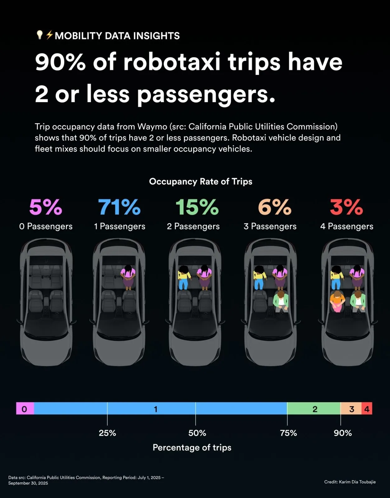 Le concept à deux places vient d'être justifié par les dernières statistiques sur les taux d'occupation de Waymo. Il s'avère que 90 % des trajets sans chauffeur effectués dans un robotaxi se font avec une ou deux personnes. La grande majorité d'entre eux se font également avec une seule personne, tandis que seulement 9 % comprennent au moins une personne sur les sièges avant.