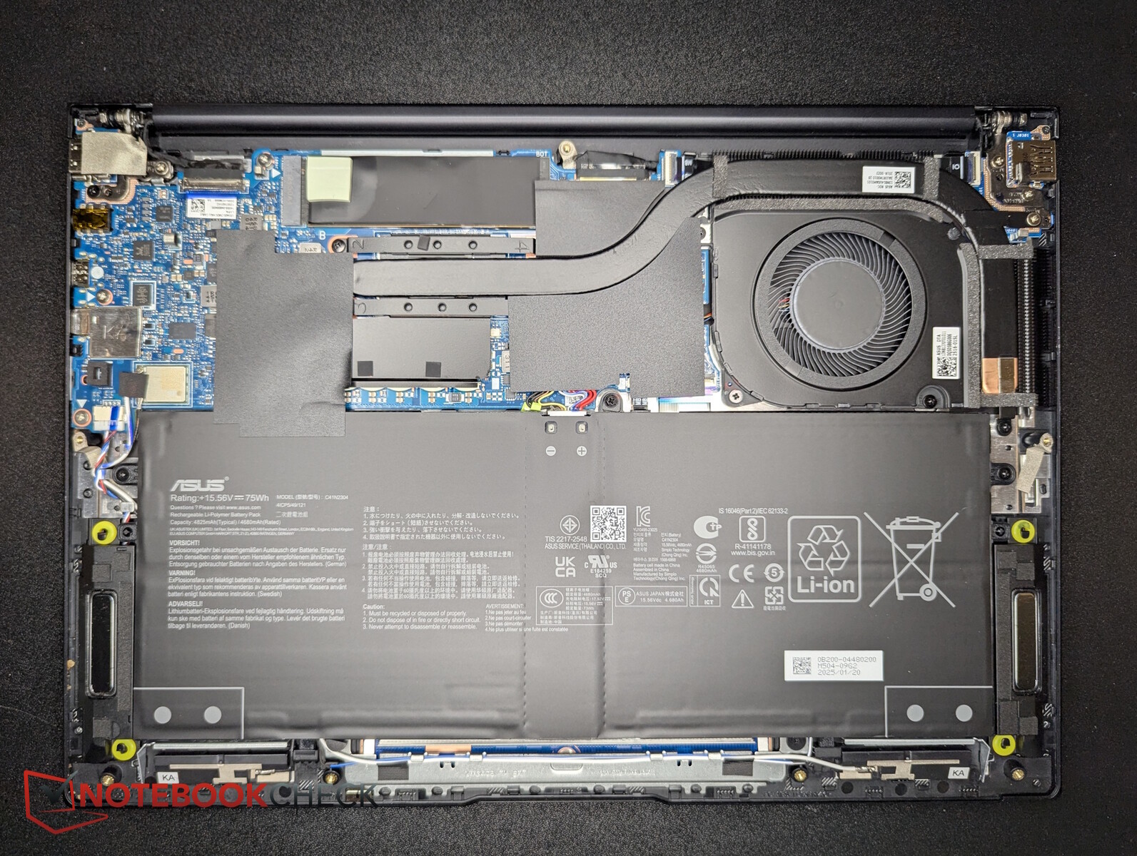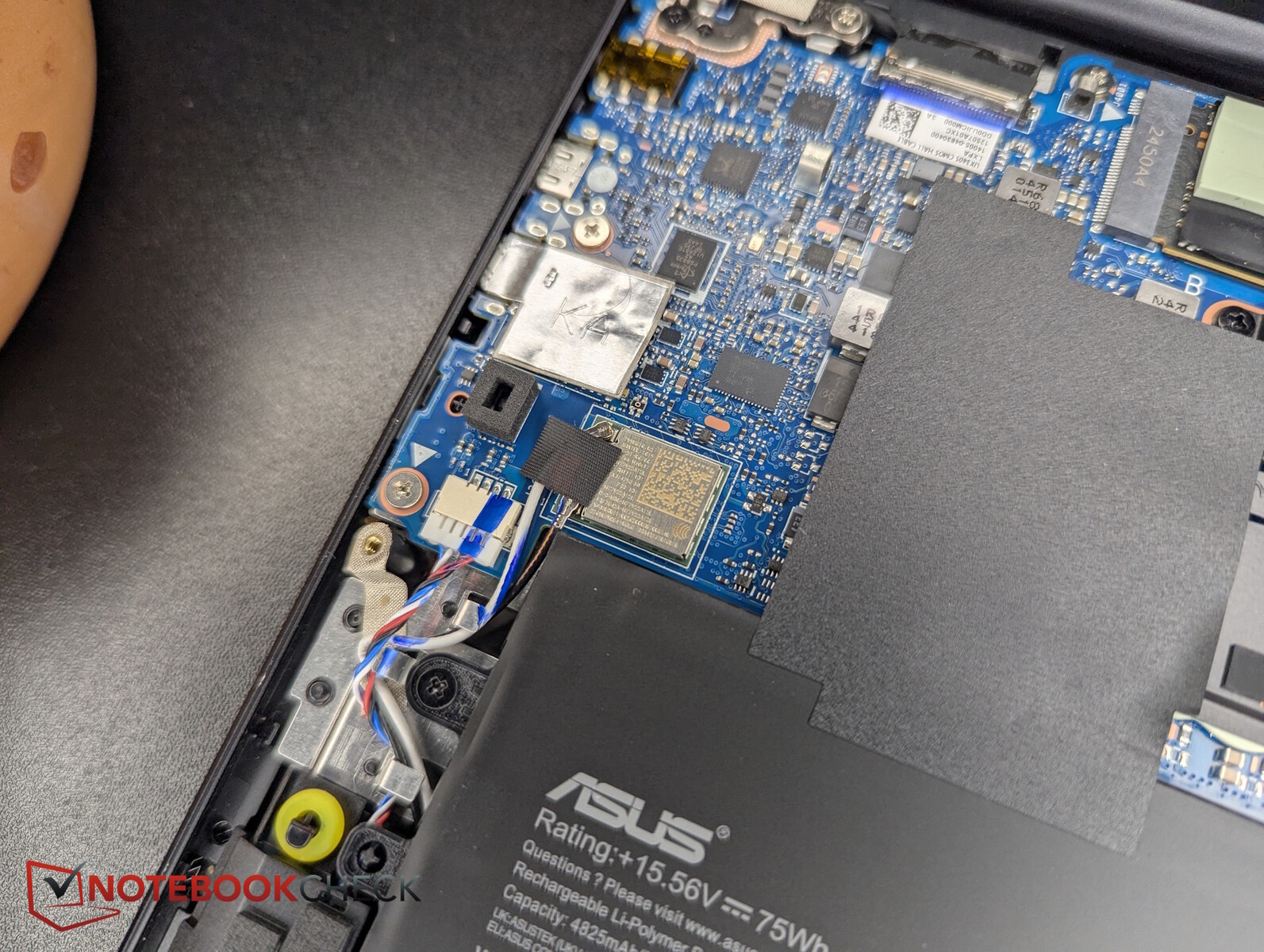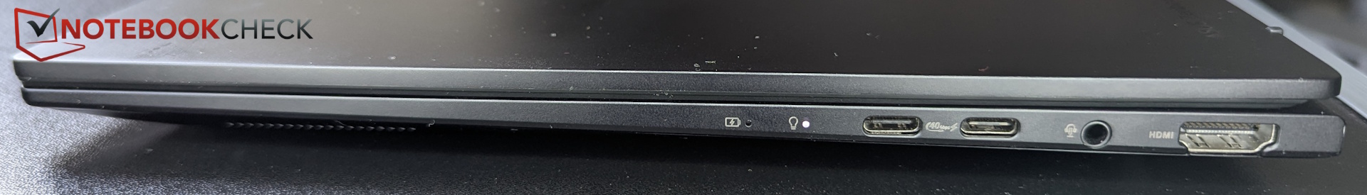 Sur le plan de la connectivité, rien n'a radicalement changé : le port USB-A plafonne toujours à 5 Gbit/s et il n'y a pas de lecteur de cartes. Alors que le modèle Modèle Intel offre deux ports Thunderbolt, la version AMD dispose d'un port USB4 et d'un port USB-3.2 Gen 2 Type-C. Nous préférerions qu'Asus divise les deux ports USB en deux. Nous aurions tout de même préféré qu'Asus sépare les deux ports USB-C afin que vous puissiez charger l'ordinateur portable de chaque côté sans étirer le câble d'alimentation relativement court.