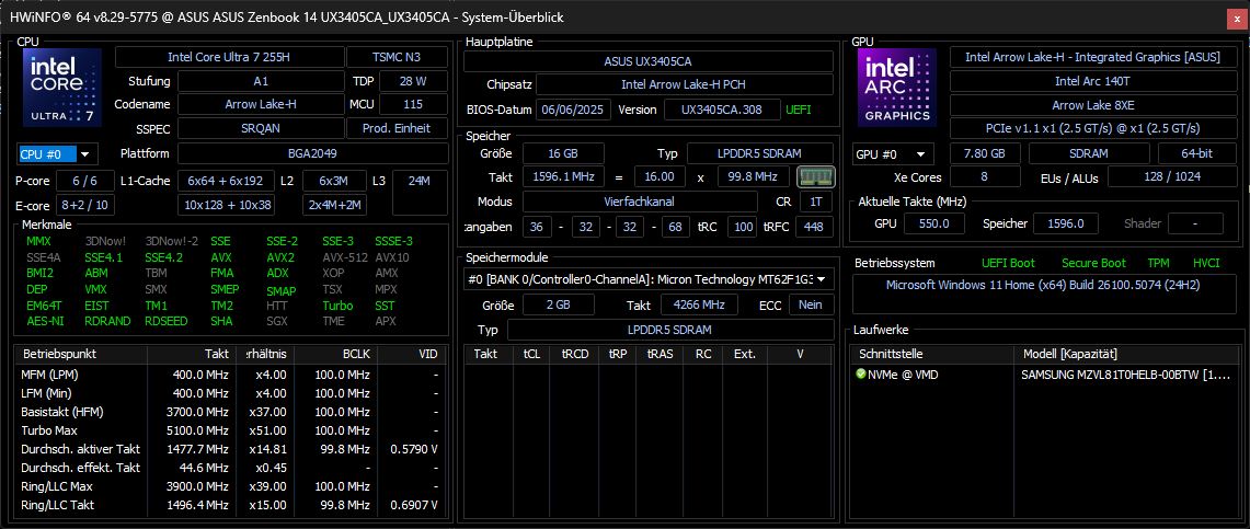 Asus ZenBook 14 OLED UX3405CA, Ultra 7 255H