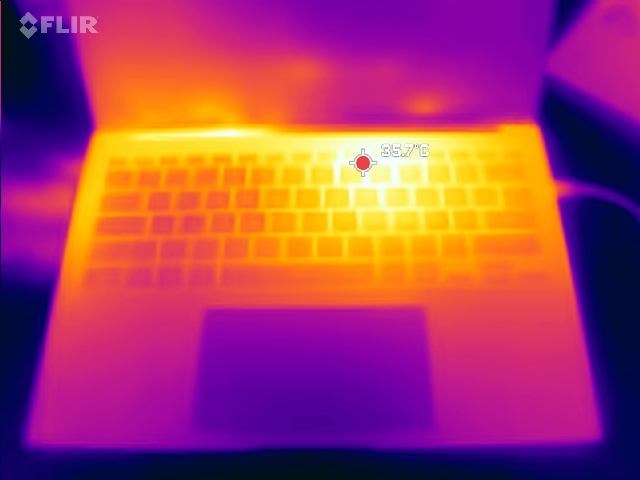 (±) 3: The average temperature for the upper side is 34.1 °C / 93 F, compared to the average of 30.8 °C / 87 F for the class Subnotebook.
