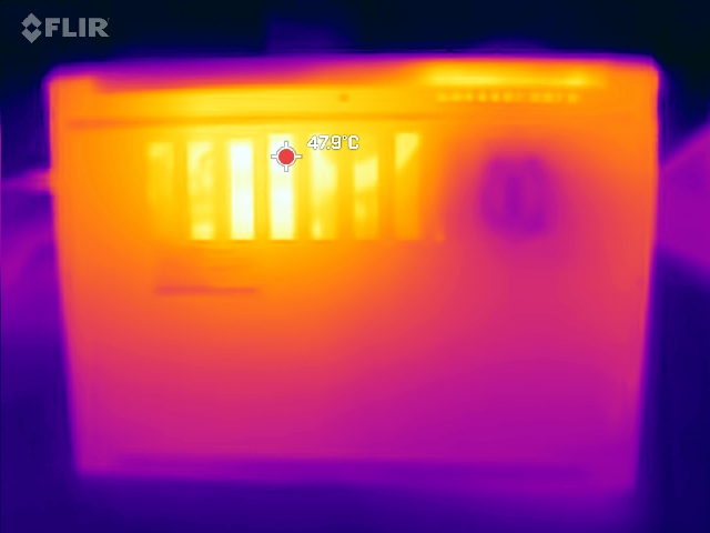 Le point chaud à pleine charge atteint 47 °C, soit à peu près la même température que la version AMD Version AMD (sur la face inférieure, près de l'écran). Cependant, le système Intel reste un peu plus frais sur le côté, loin du ventilateur unique. La zone gauche du clavier et les repose-paumes en particulier restent confortablement frais.