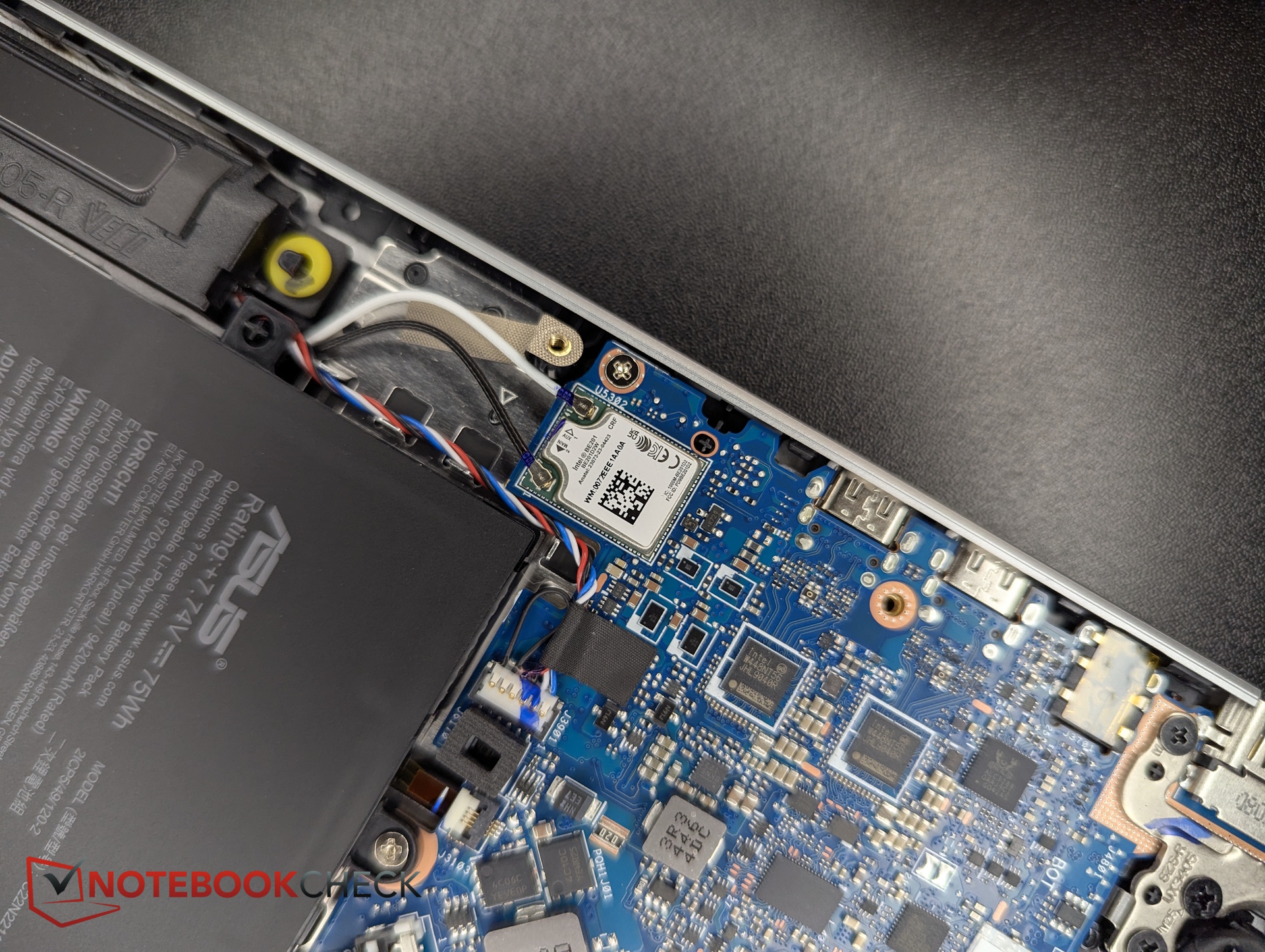 Au lieu d'un module MediaTek, ce modèle utilise la puce Wi-Fi 7 BE201 d'Intel. En Wi-Fi 5 et Wi-Fi 6E, le ZenBook d'AMD parvient toutefois à des taux de transfert légèrement plus élevés.