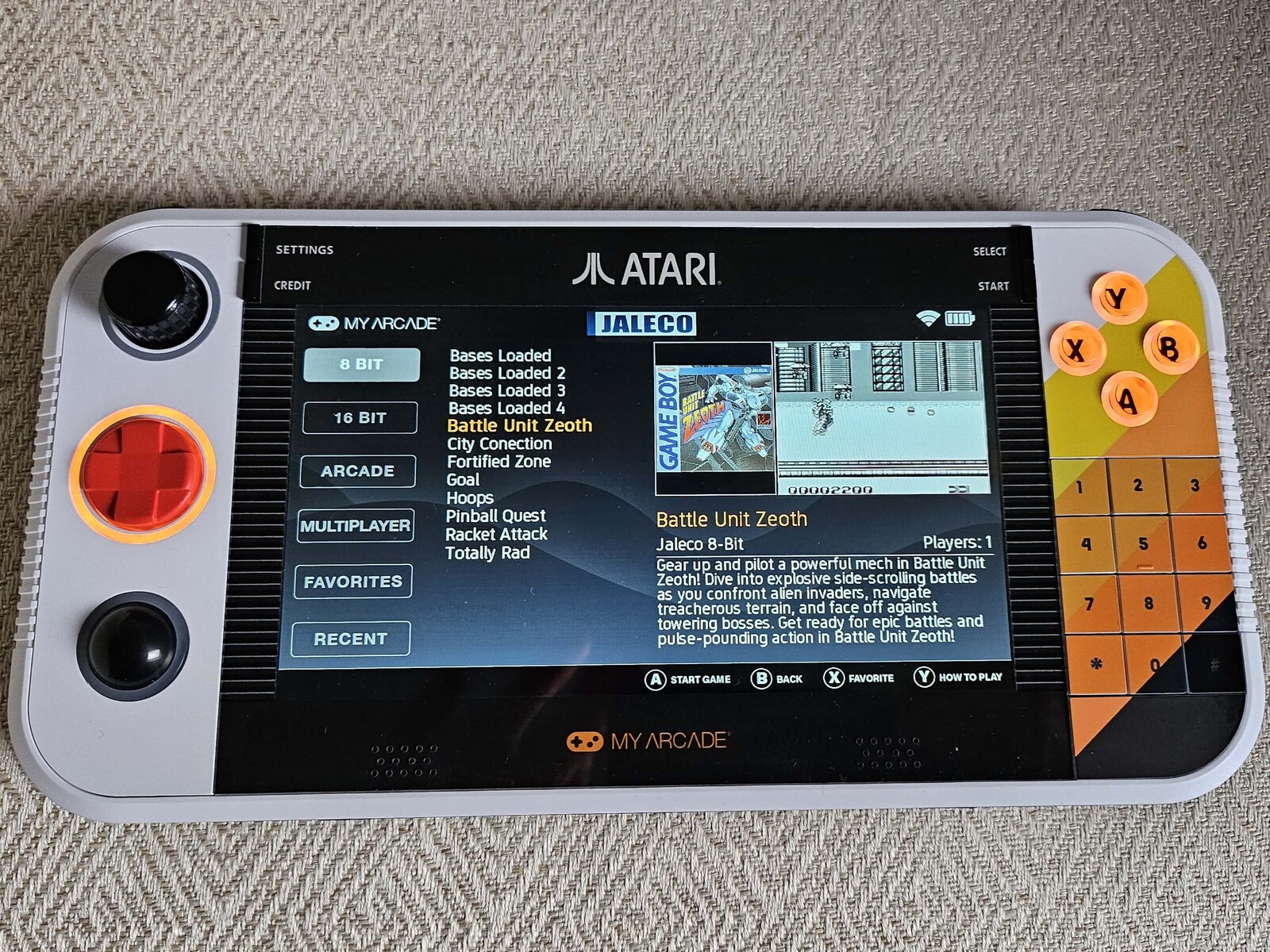 Les 200 jeux intégrés s'adressent à un large éventail de joueurs et offrent réellement quelque chose à chacun. En plus des titres d'Atari, le système comprend plusieurs jeux de Piko et de Jaleco, bien qu'on ne sache pas exactement pourquoi ces sélections particulières ont été choisies. Chaque titre est affiché dans le menu avec sa couverture originale - par exemple, la version Game Boy de Battle Unit Zeoth - accompagnée d'une courte vidéo en lecture automatique et d'une description en anglais. Le menu principal est divisé en catégories telles que Atari Recharged, Atari, Balls of Steel, Pac-Man, Jaleco, Piko et Settings. Des sous-menus organisent la bibliothèque en 8-bit, 16-bit, Arcade, Multiplayer, Favorites, et Recently Played. Les habitués des interfaces comme RetroArch ou Retro Deck se sentiront à l'aise : tout est bien structuré et se lance rapidement.