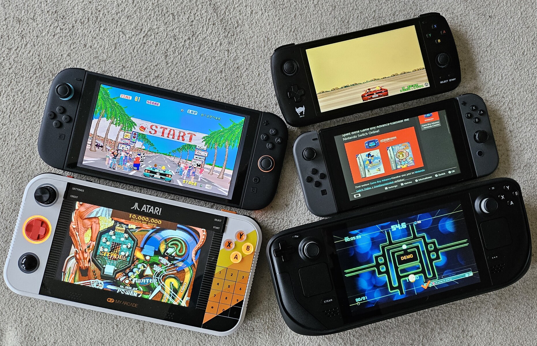 La Gamestation Go comparée en taille à la Switch 2, Ayn Odin, Switch 1 et Steam Deck (de haut en gauche à bas en droite, source de l'image : Marc Zander, Notebookcheck)