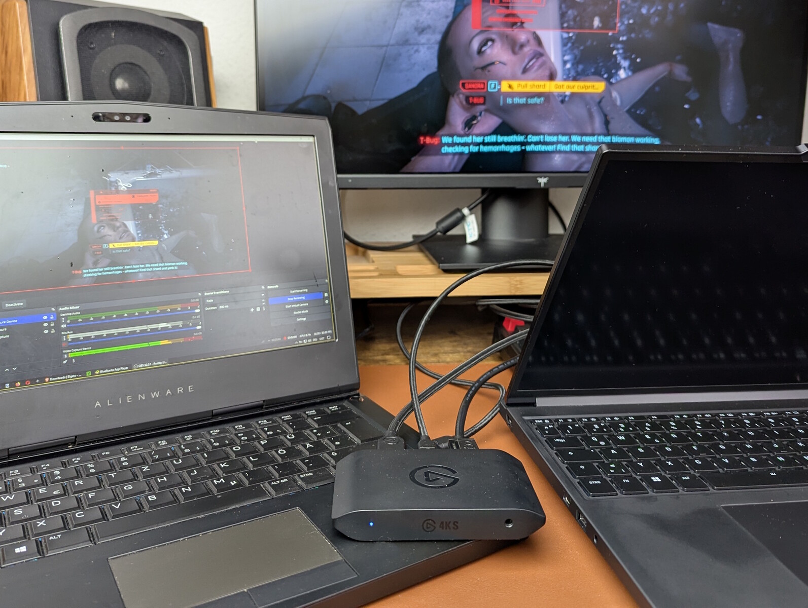 - Capture de jeux sur PC : Nous avons connecté un ordinateur portable de jeu XMG Pro 16 à la 4K S et enregistré le gameplay de Cyberpunk 2077 en 4K. Un second ordinateur portable a été connecté à la carte d'acquisition via USB-C, pour l'enregistrement dans l'application Elgato ou OBS. Nous avons également examiné la latence.