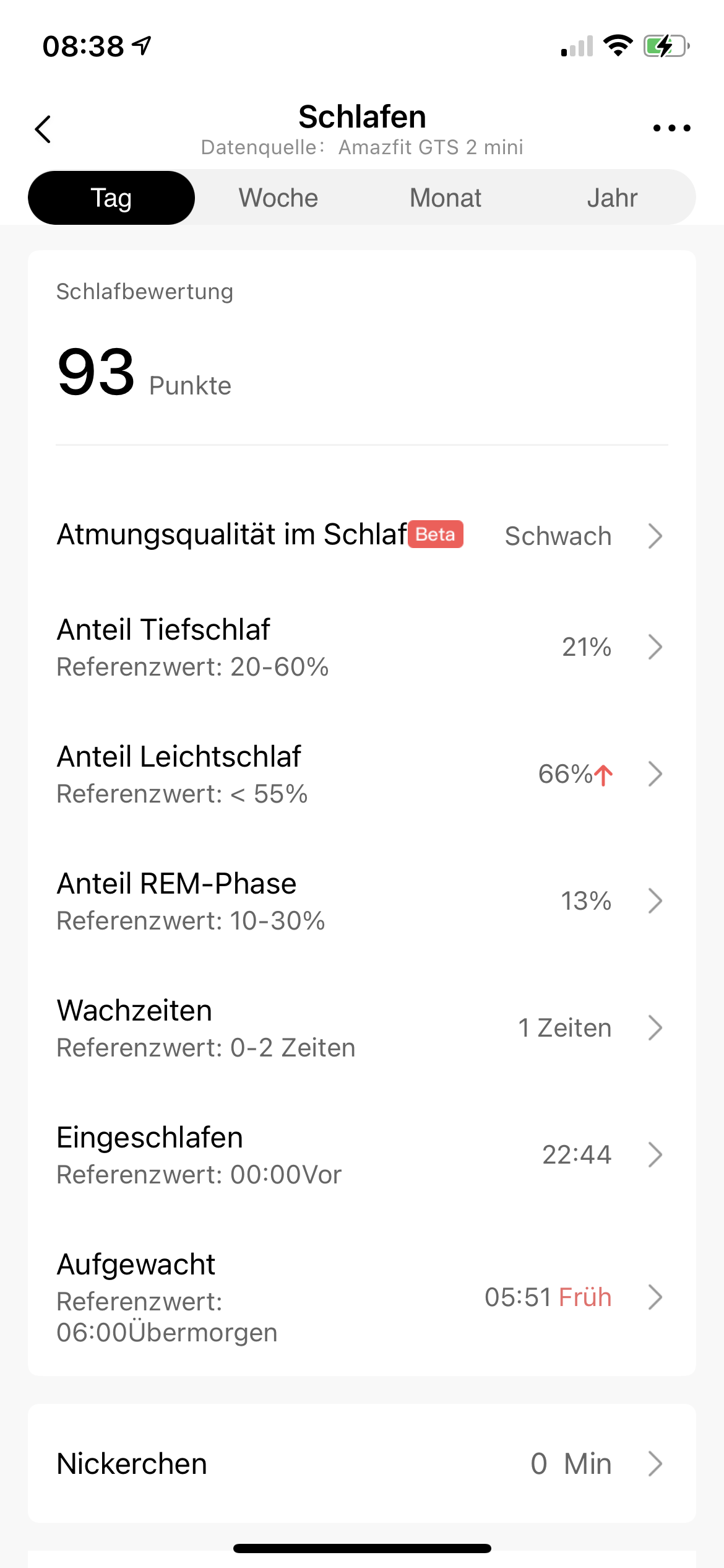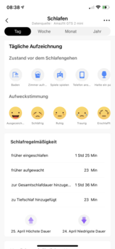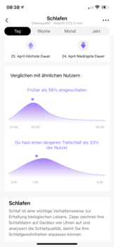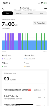 L'Amazfit GTS 2e enregistre l'heure à laquelle l'utilisateur s'endort et se réveille et analyse les phases de sommeil. Si vous comparez le journal de la même nuit avec celui du Amazfit GTS 2 mini, vous constaterez également des différences, même si les deux appareils utilisent le même réglage pour l'intensité de la mesure du pouls. Même après avoir changé les bracelets entre le poignet gauche et le poignet droit, il semble que l'Amazfit GTS 2e suive le sommeil avec plus de précision que l'Amazfit GTS 2 miniHuami Amazfit GTS 2 mini im Test: Funktionale und derzeit reduzierte Smartwatch mit Alexa.