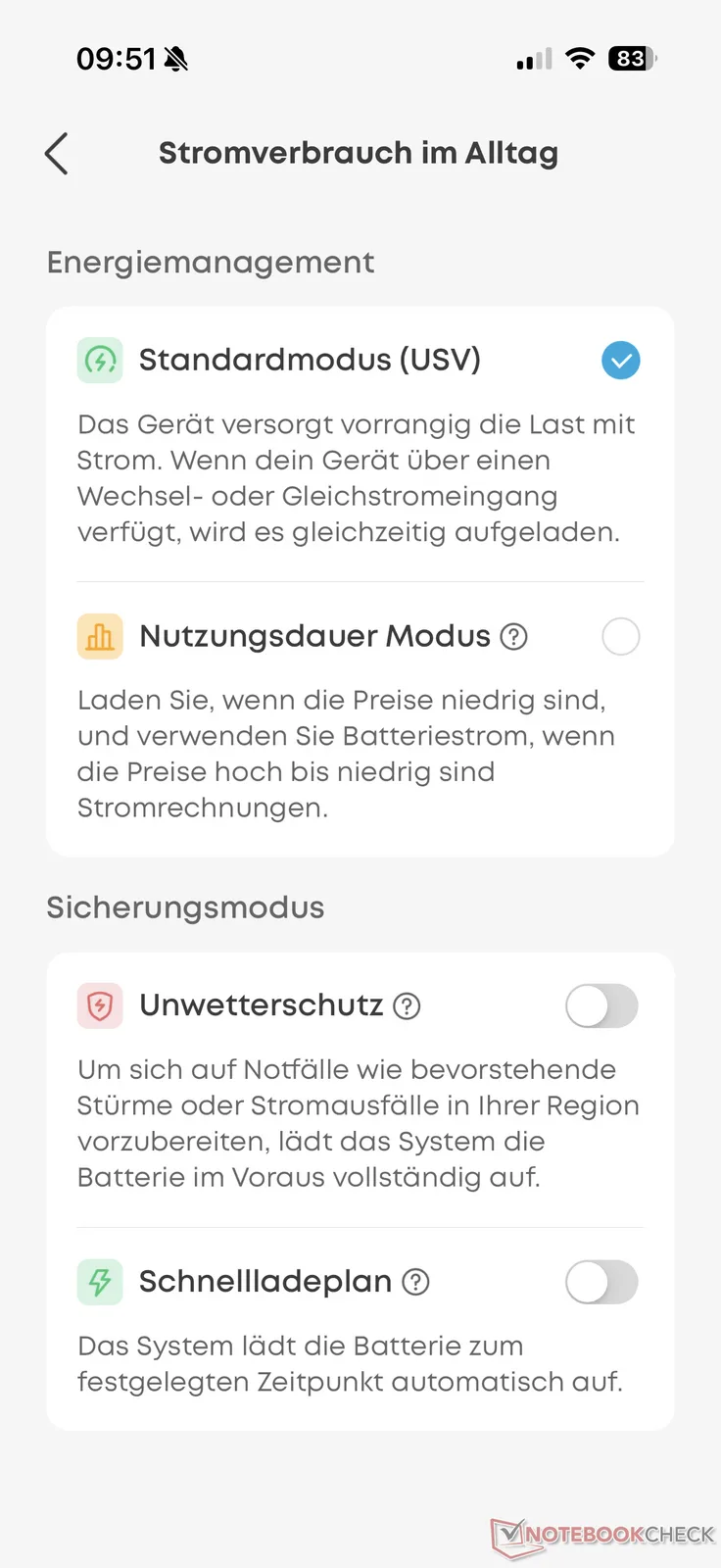 Alors que nous l'avons raté sur le F3000le C2000 Gen 2, comme le C1000 Gen 2dispose de différents modes. Par exemple, la centrale peut être réglée pour se charger automatiquement aux moments où les coûts de l'énergie sont particulièrement favorables, en liaison avec un tarif d'électricité dynamique. Cependant, il n'y a toujours pas de connexion directe.