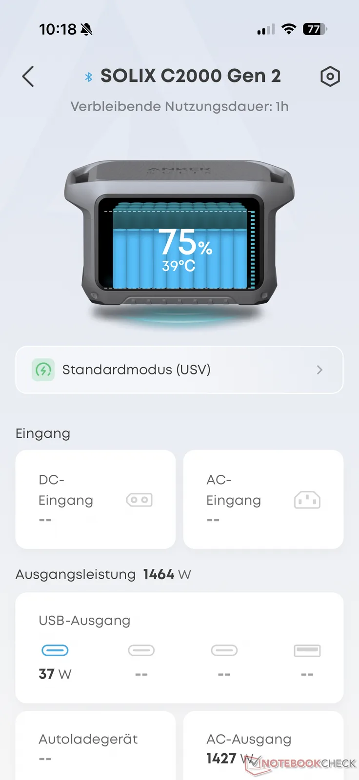 Cependant, plus la puissance CA est élevée, plus le C2000 Gen 2 est efficace (comme beaucoup d'autres centrales électriques). 1 800 W de courant alternatif peuvent être tirés de la centrale, ce qui permet d'utiliser environ 1 850 Wh. Cela représente un bon 90 pour cent et une valeur remarquable. Pendant la charge en courant alternatif, qui peut être effectuée à une puissance allant jusqu'à 2 300 W en un peu plus d'une heure (en fonction de la puissance maximale réglée), l'appareil de mesure a enregistré une consommation de près de 2 350 Wh. La batterie de 2 048 Wh a donc été utilisée à 87 %.