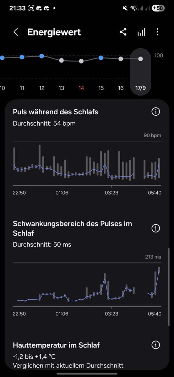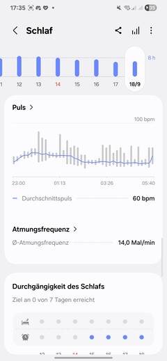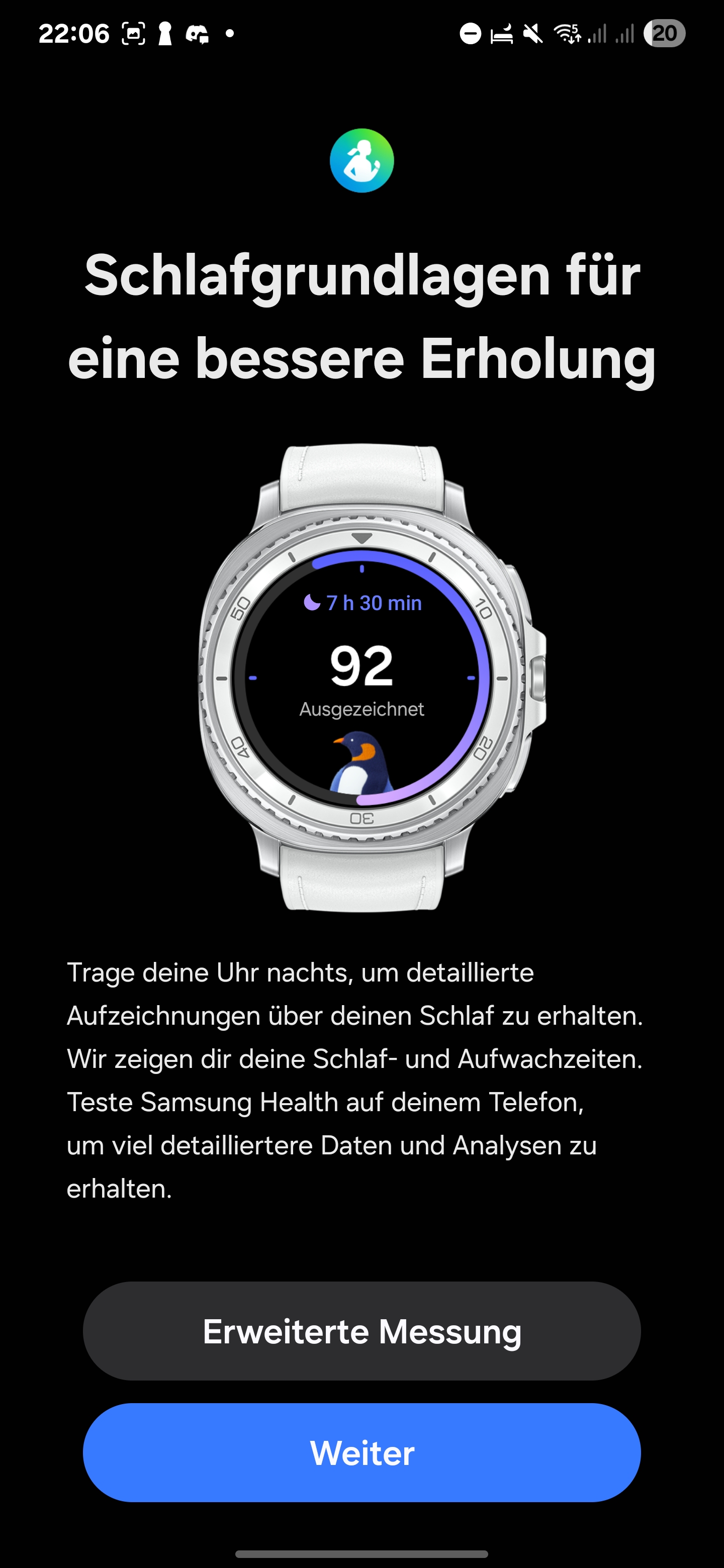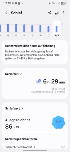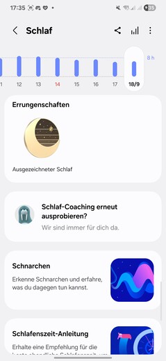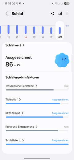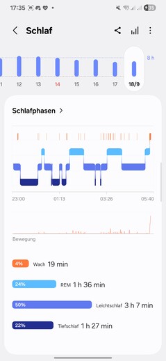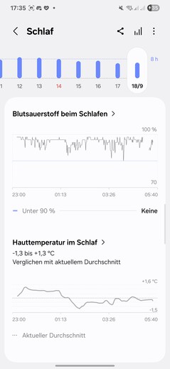 Samsung utilise un système de score de sommeil pour le suivi du repos. Il combine des mesures telles que la durée totale du sommeil, les phases profondes et REM, la récupération et la latence, et est complété par des recommandations personnalisées et des tendances à long terme. La montre enregistre également la fréquence cardiaque, la température, la saturation en oxygène et la fréquence respiratoire. Les ronflements et l'apnée du sommeil peuvent être détectés lorsque la smartwatch est couplée à un smartphone.