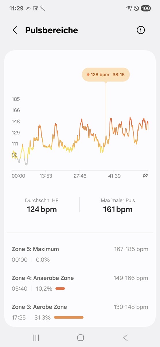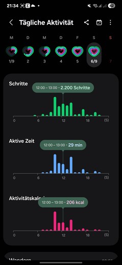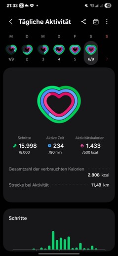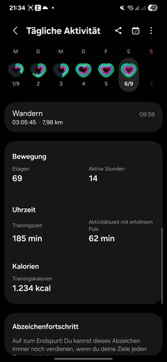 La détection automatique des séances d'entraînement fonctionne très bien. L'application Samsung Health comprend également des cours d'entraînement vidéo, dont certains sont payants. Lors des tests, nous avons parfois enregistré des entrées incorrectes pour la gymnastique en utilisant le bouton rapide.