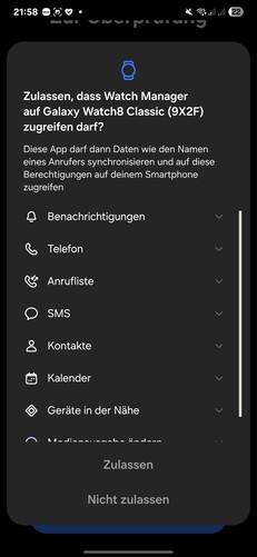 Lorsqu'elle est mise sous tension pour la première fois, la Galaxy Watch8 Classic est automatiquement détectée par les smartphones Android. L'installation se fait via l'application Samsung Wear, qui nécessite un plugin supplémentaire pour la montre. Un compte Google est obligatoire et de nombreuses autorisations doivent être accordées lors de l'installation.