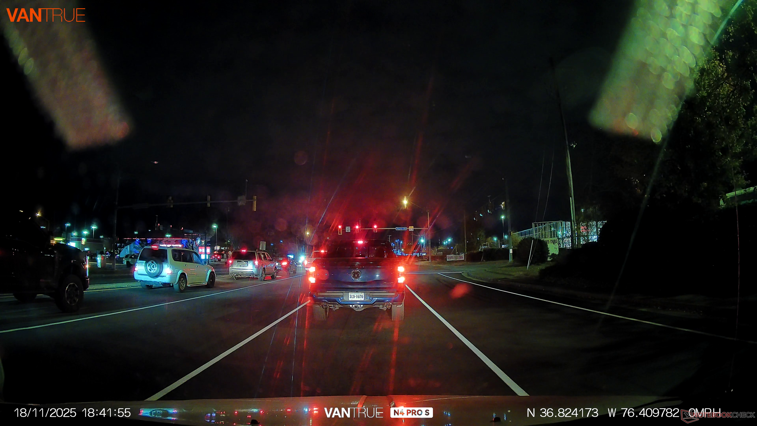 De jour comme de nuit, la Vantrue a produit des vidéos claires, sans lacunes, et les couleurs ont été accentuées par le filtre CPL. Comme prévu, les capteurs Starvis 2 ont fourni une vision nocturne extérieure exceptionnelle, capturant les détails même dans des environnements à faible luminosité, et comme la caméra arrière se trouve à l'extérieur du véhicule, il n'y a pas eu de reflets de verre pour obscurcir les séquences. Avec les paramètres par défaut, la caméra et ses capteurs ont suivi avec précision l'emplacement du véhicule testé. Toutefois, il a été noté que les paramètres par défaut semblaient légèrement plus sensibles sur ce modèle, déclenchant des enregistrements d'événements lors de petites bosses plus fréquemment que prévu. Ceux qui souhaitent moins de notifications peuvent adapter la sensibilité du capteur G dans les paramètres. Les paramètres contiennent également de nombreuses options, et les utilisateurs disposant du kit de câblage peuvent profiter de fonctions telles que la détection de mouvement et la surveillance active. Il convient également de noter que le kit de câblage n'a pas déchargé la batterie du véhicule de test et n'a causé aucun problème au démarrage.