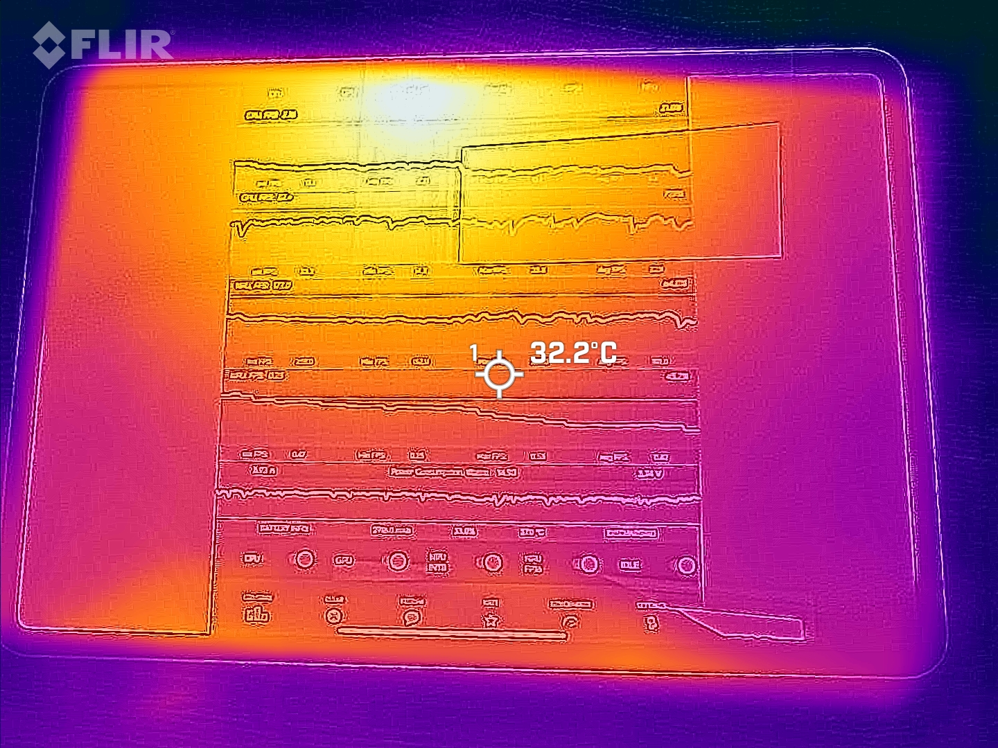 Les températures de surface du boîtier de la tablette sont très hétérogènes dans notre scénario de charge, mais elles se situent également à un niveau non critique dans la zone du point chaud.