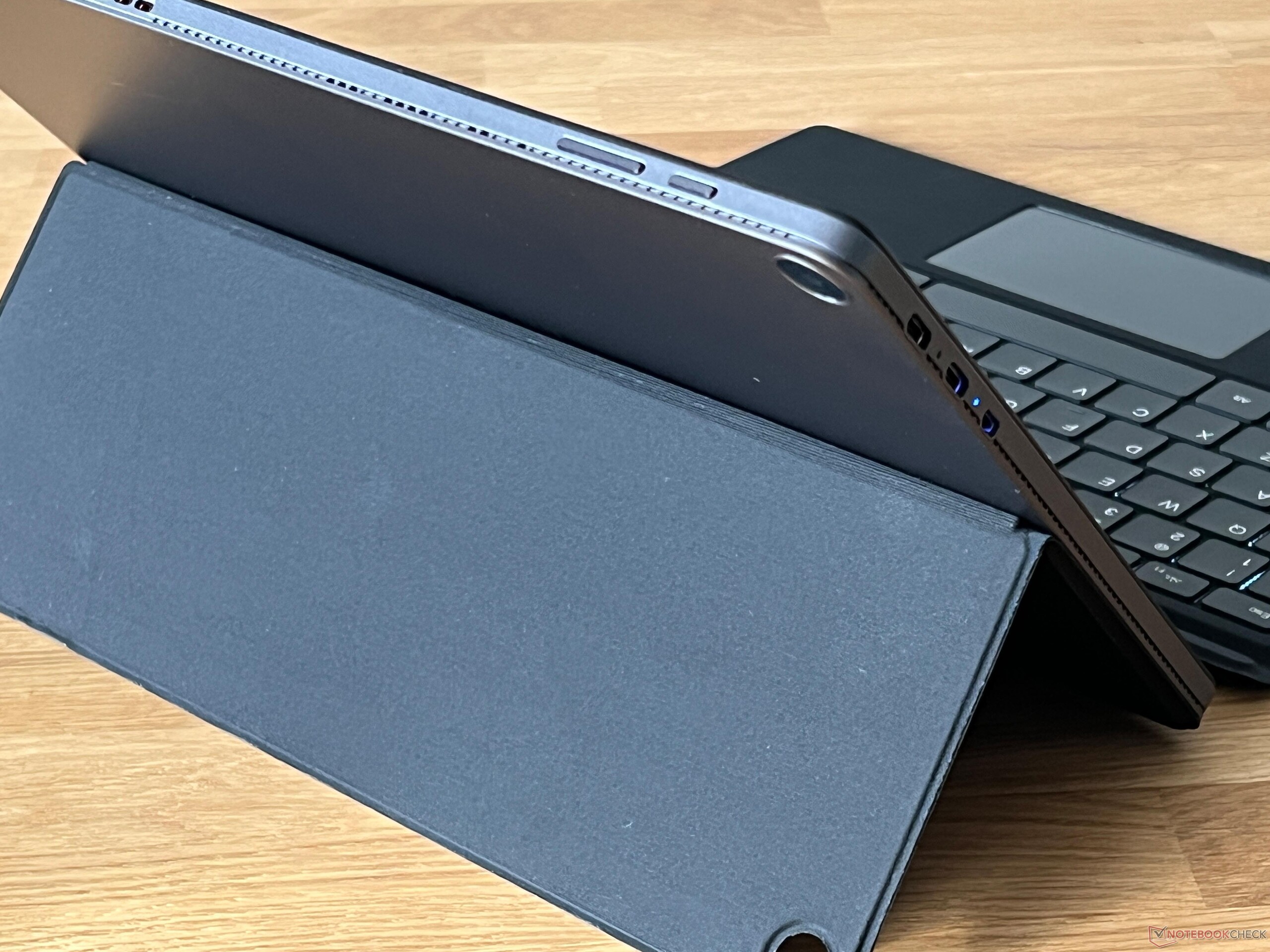 Le Hi10 Max est une tablette sans béquille intégrée. Chuwi utilise une construction métallique et le boîtier gris foncé semble de haute qualité, bien que de légers craquements soient perceptibles lorsque l'appareil est tordu. L'écran peut également être enfoncé visiblement avec un peu de force, mais cela n'affecte pas négativement la fonctionnalité. Les saisies tactiles normales n'entraînent pas ce problème. L'emballage comprend un couvercle arrière avec une découpe pour l'appareil photo, dont la moitié inférieure se fixe magnétiquement au boîtier. La partie supérieure peut être rabattue pour servir de support, ce qui fonctionne bien en pratique et offre une protection supplémentaire. Le protège-clavier optionnel est fixé sur la face inférieure, mais la connexion n'est pas particulièrement stable et a tendance à se détacher rapidement.