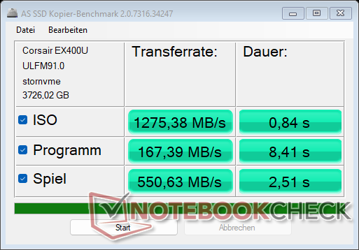 Nous avons mesuré les performances du support de stockage externe sur différents appareils. En utilisant l'Asus Zenbook OLED avec le rapide Intel Core Ultra 9 288V, nous avons obtenu d'excellentes valeurs de performance qui dépassent même de peu les spécifications pour la lecture séquentielle (test diskspd). Le Corsair est exceptionnel dans les tests synthétiques de lecture et d'écriture et ne déçoit pas non plus dans les autres tests synthétiques. Cependant, dans le benchmark AS SSD Copy, les performances sont nettement inférieures à celles des disques SSD intégrés rapides.