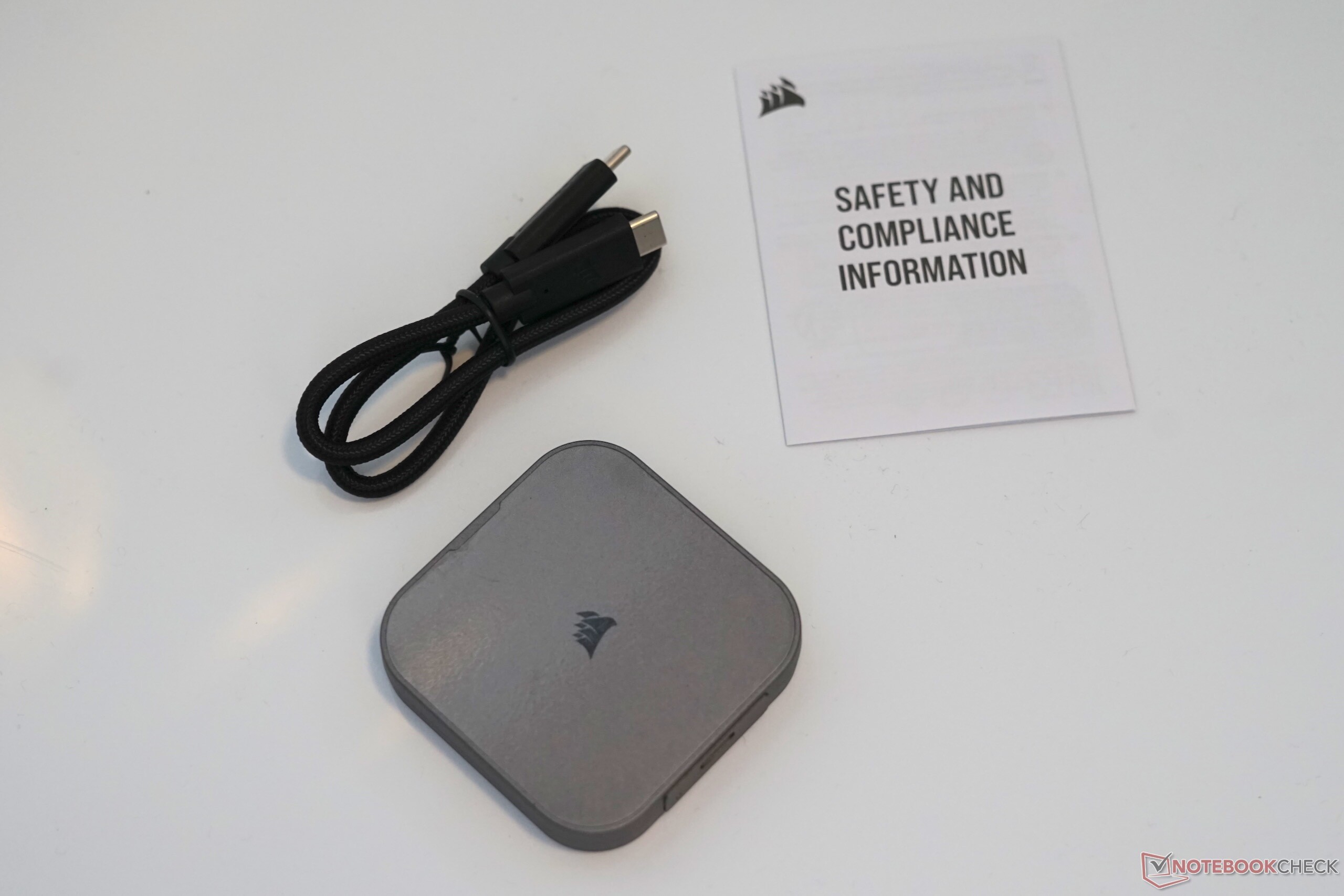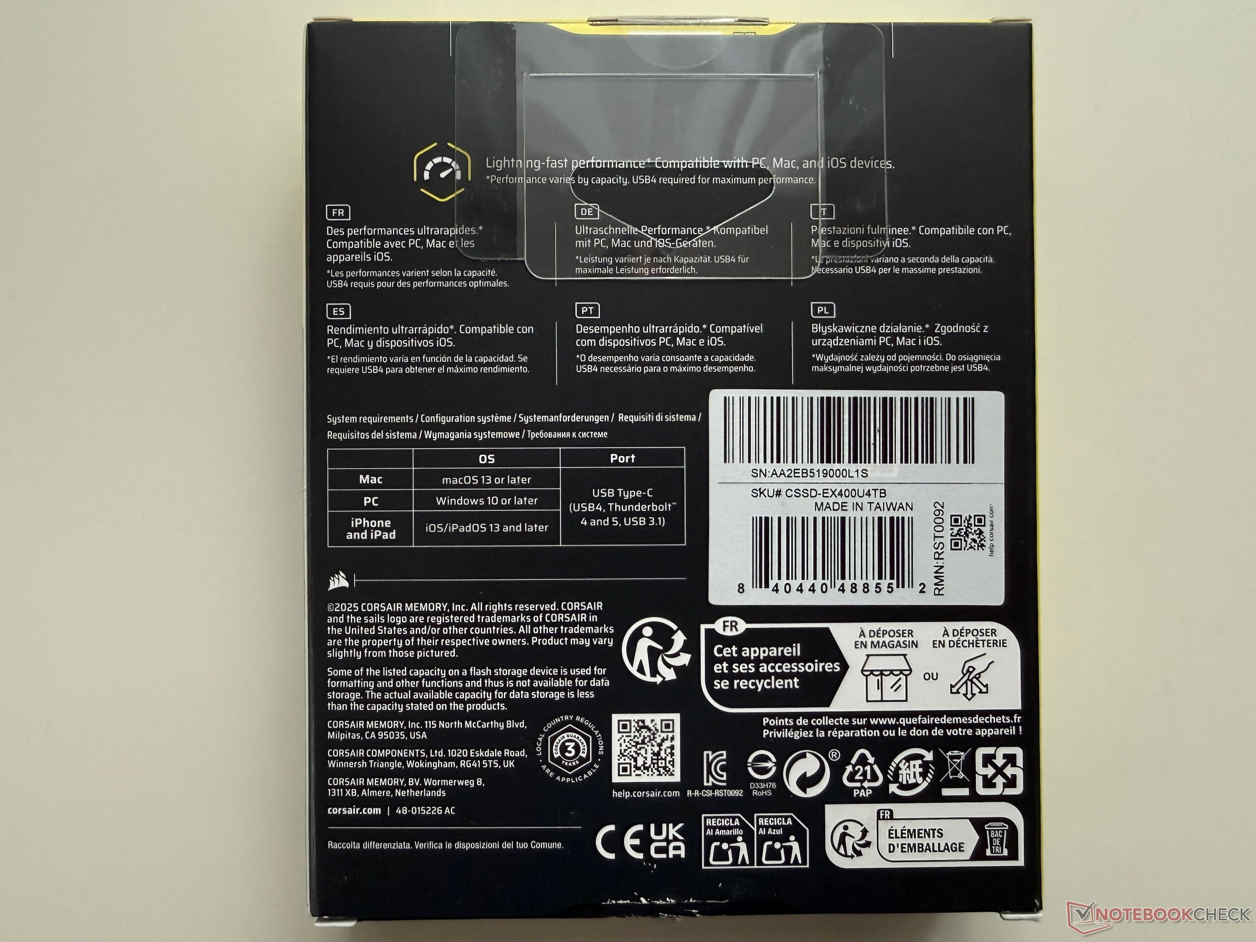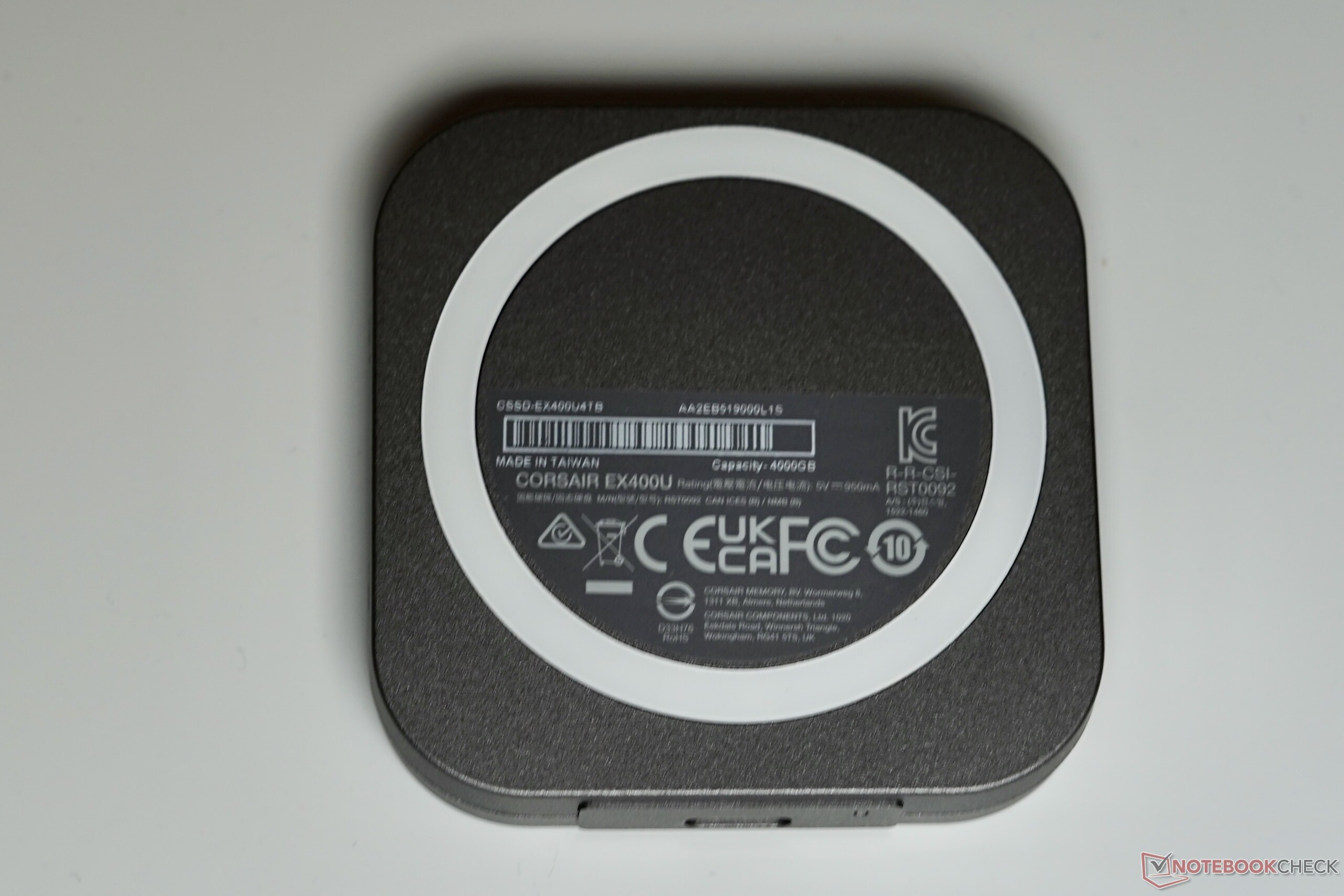 Le Corsair EX400U 4TB (CSSD-EX400U4TB) est alimenté par le contrôleur Phison PS2251, qui offre un support USB natif. Selon Corsair, les puces mémoire TLC NAND utilisées proviennent de Kioxia. Le SSD offre une garantie de 3 ans tant que le TBW (Tobal Bytes Written) de 1 000 téraoctets (pour le modèle 4TB) n'est pas dépassé. Le SSD est doté d'un anneau MagSafe à l'arrière. Cela permet de fixer le SSD à tous les iPhones actuels et, par exemple, d'écrire ProRes directement sur le SSD de l'iPhone 16 Pro lors du test.