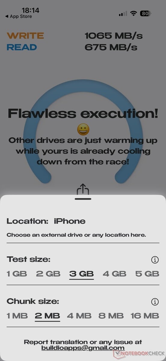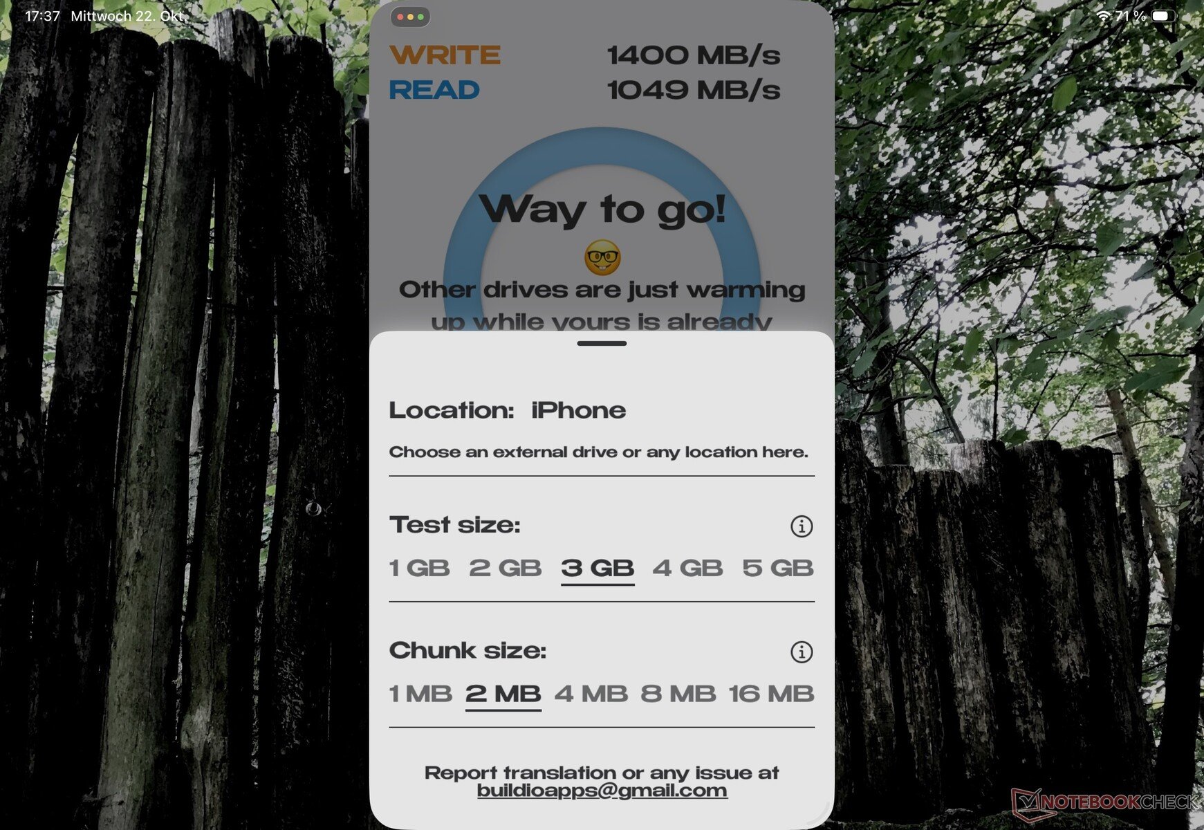 Utilisation d'un iPad Pro (M4 de 2024 avec SSD de base de 256 Go) les performances du SSD Corsair sont impressionnantes. Des performances en lecture plus de deux fois plus rapides et des performances en écriture 66 % plus rapides parlent d'elles-mêmes. Cependant, il est loin d'atteindre la vitesse maximale de 4 000 Mo/s. Pour l'iPhone 16 Pro, c'est une autre histoire, car le port USB permet des performances nettement inférieures. L'EX400U n'atteint que 860 / 770 Mo/s (lecture / écriture). Cependant, au moins en écriture, elle est légèrement plus rapide que le SSD interne de 128 Go.