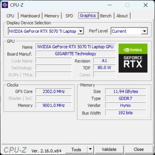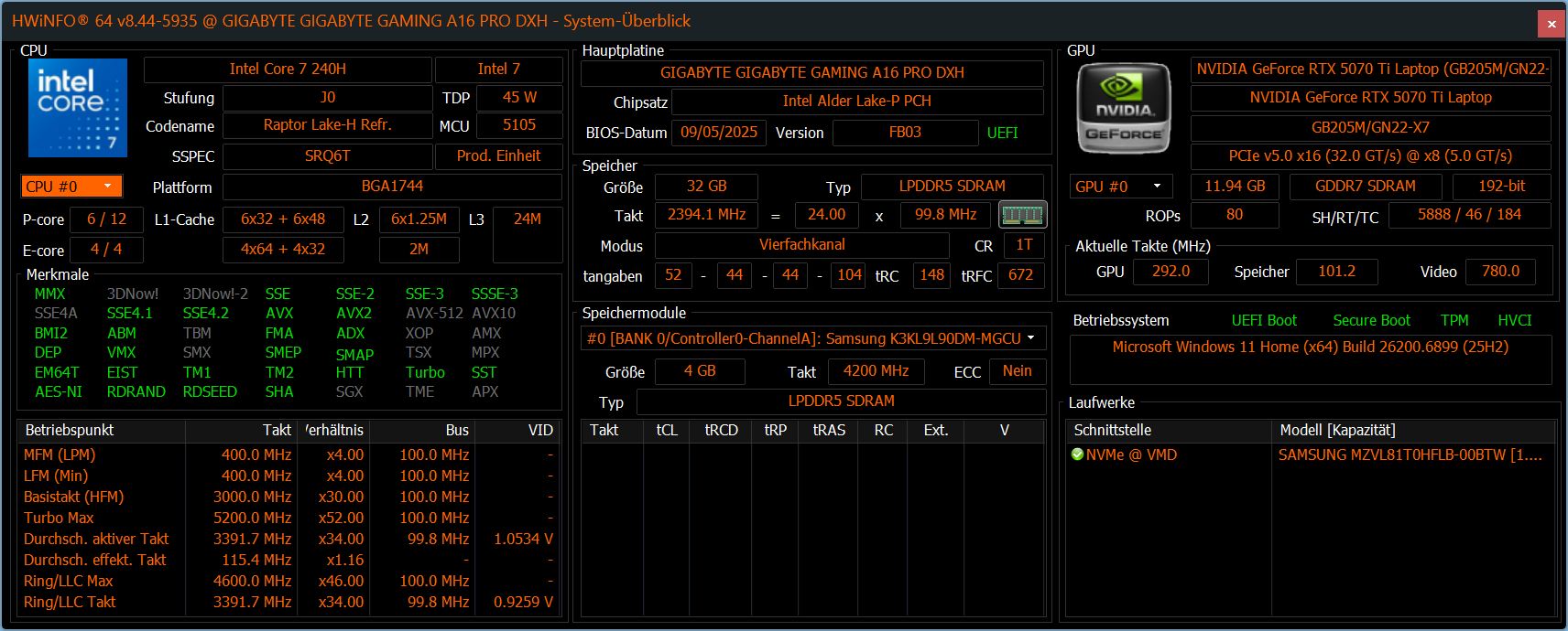 | Gigabyte Gaming A16 Pro GA6DH (Core 7 240H, RTX 5070 Ti) Intel Core 7 240H ⎘ NVIDIA GeForce RTX 5070 Ti Laptop ⎘ 32 Go Mémoire, 1000 Go SSD | Prix de liste: 2300 Euro | 2.4 kg | 22.99 mm | 16.00" 2560x1600 189 PPI IPS | |