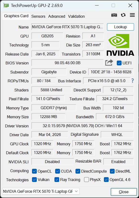 | Gigabyte Gaming A16 Pro GA6DH (Core 7 240H, RTX 5070 Ti) Core 7 240H, GeForce RTX 5070 Ti Laptop, Samsung PM9C1b MZVL81T0HFLB-00BTW, IPS, 2560x1600, 16" | Gigabyte Gaming A16 GA6H i7-13620H, GeForce RTX 5070 Laptop, Kingston OM8PGP41024Q-A0, IPS, 2560x1600, 16" | Schenker XMG APEX 16 MAX R9 9955HX, GeForce RTX 5070 Ti Laptop, Samsung 9100 Pro 2 TB, Mini-LED, 2560x1600, 16" | Acer Predator Helios Neo 16S AI PHN16S-71-94L9 Ultra 9 275HX, GeForce RTX 5070 Ti Laptop, Micron 3500 1TB MTFDKBA1T0TGD, OLED, 2560x1600, 16" | Medion Erazer Major 16 X1 MD62736 Ultra 7 255HX, GeForce RTX 5070 Ti Laptop, Phison E31 2 TB, IPS, 2560x1600, 16" | Lenovo Legion 5 Pro 16IAX10H Ultra 9 275HX, GeForce RTX 5070 Ti Laptop, Western Digital PC SN8000S SDEPNRK-1T00, OLED, 2560x1600, 16" | Moyenne NVIDIA GeForce RTX 5070 Ti Laptop | Moyenne de la classe Gaming | |