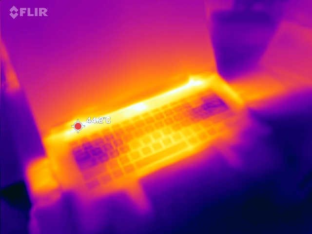 (±) La température maximale du côté supérieur est de 42 °C / 108 F, par rapport à la moyenne de 40.4 °C / 105 F, allant de 21.2 à 68.8 °C pour la classe Gaming.