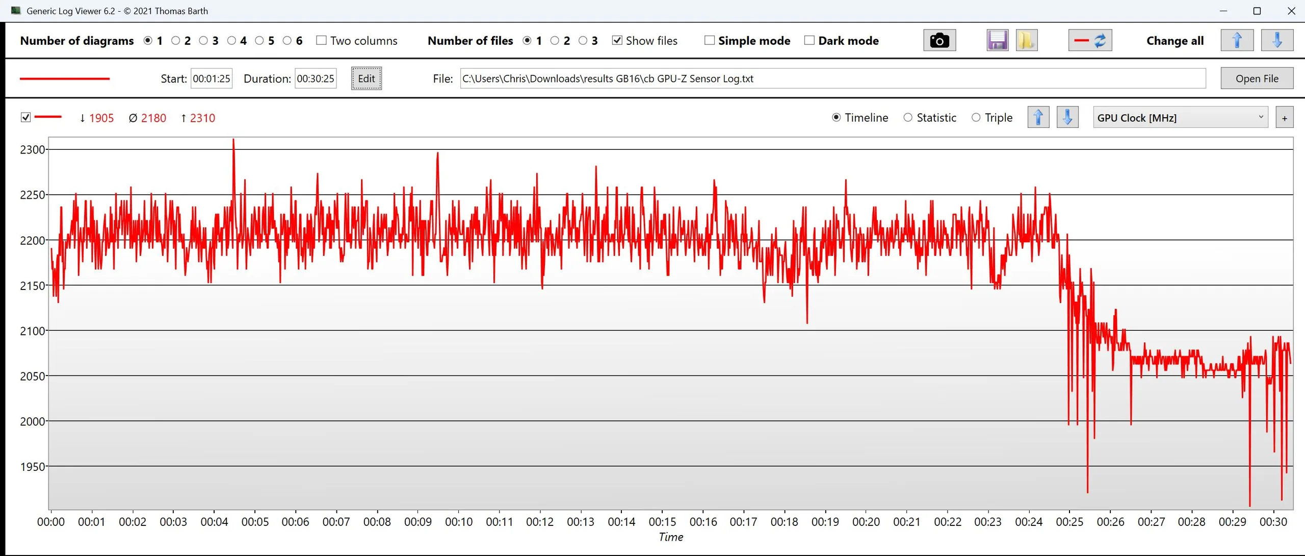 | Horloge CPU (GHz) | Horloge GPU (MHz) | Température moyenne du CPU (°C) | Température moyenne du GPU (°C) | ||