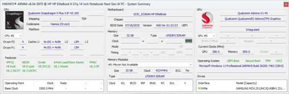 | HP EliteBook 6 G1q 14 Qualcomm Snapdragon X Plus X1P-42-100 ⎘ Qualcomm SD X Adreno X1-45 1.7 TFLOPS ⎘ 32 Go Mémoire, 512 Go SSD | Amazon: Prix de liste: 1300 USD | 1.5 kg | 17 mm | 14.00" 1920x1200 162 PPI IPS | |