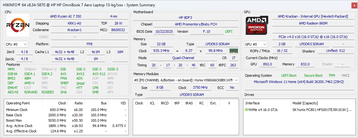 | HP OmniBook 7 Aero 13-bg1077nr AMD Ryzen AI 7 350 ⎘ AMD Radeon 860M ⎘ 32 Go Mémoire, 1024 Go SSD | Amazon: $529.99 Prix de liste: 1250 USD | 1 kg | 17.6 mm | 13.30" 1920x1200 170 PPI IPS | |