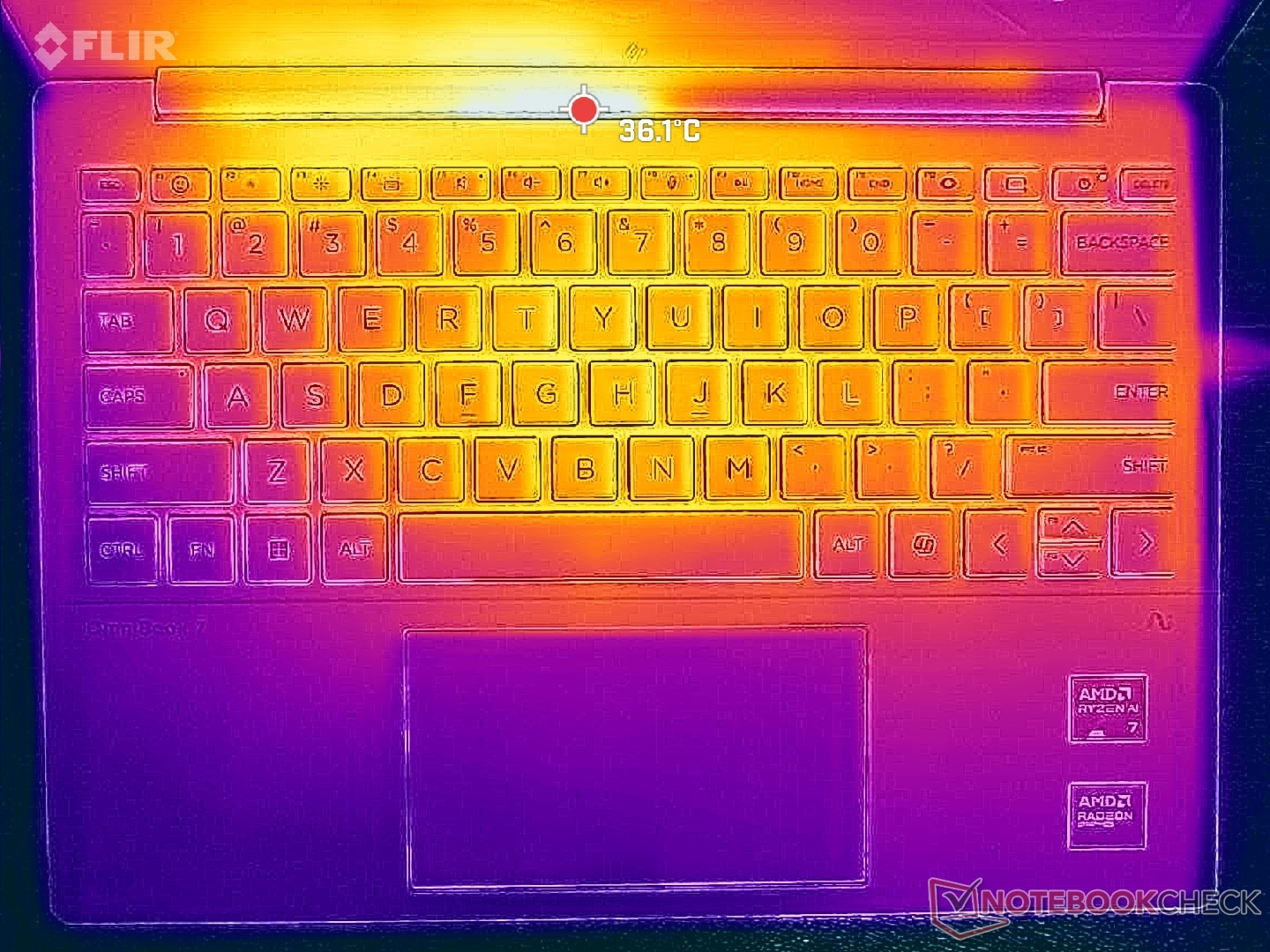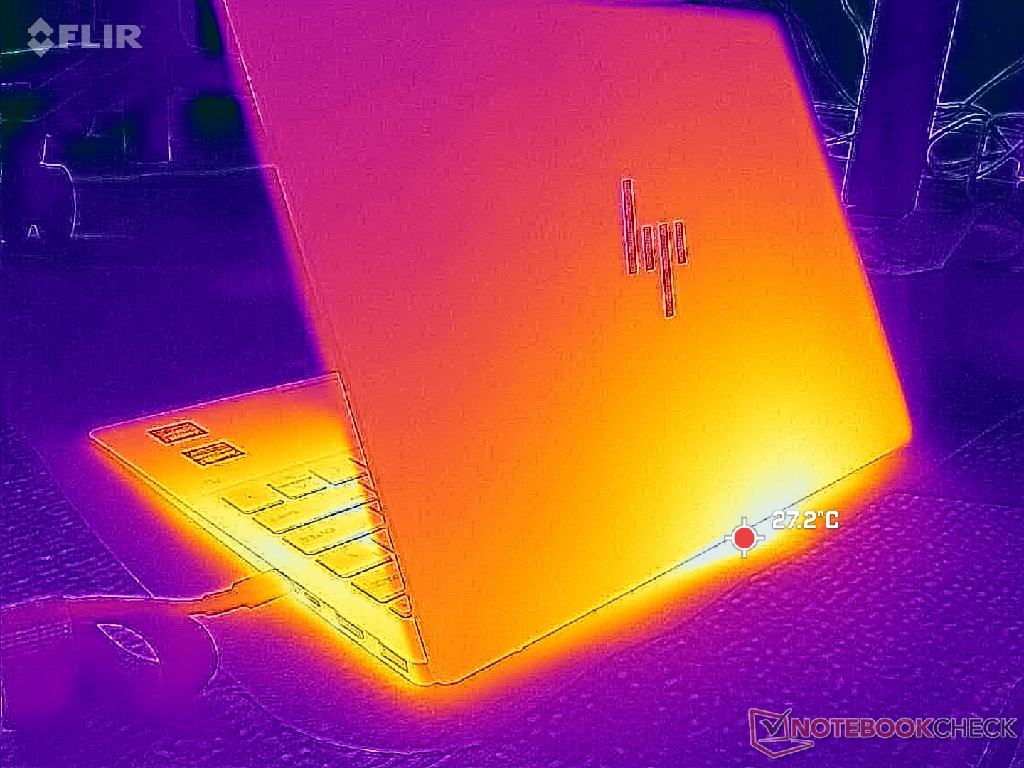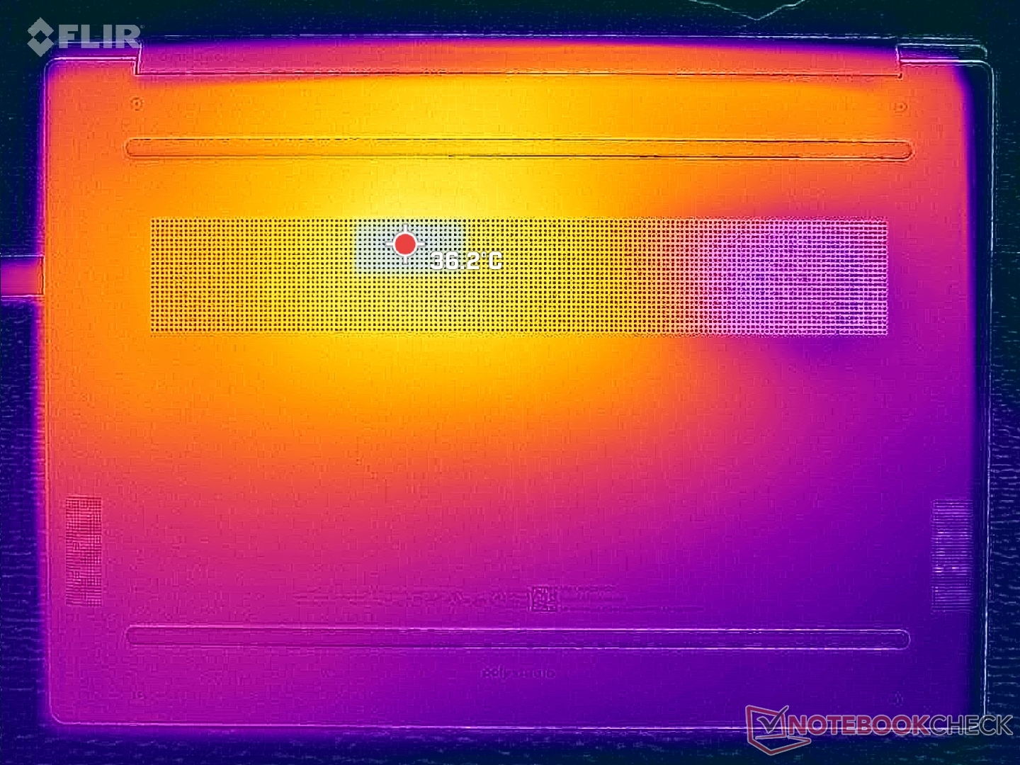 (+) La température maximale du côté supérieur est de 35.8 °C / 96 F, par rapport à la moyenne de 35.9 °C / 97 F, allant de 21.4 à 59 °C pour la classe Subnotebook.