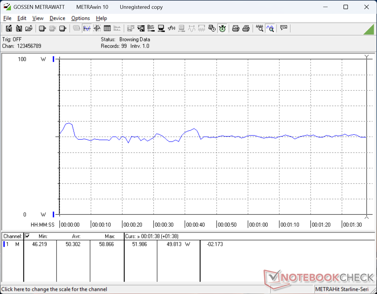 L'autonomie WLAN est néanmoins assez longue, avec près de 10,5 heures de navigation dans le monde réel. Cela est dû à plusieurs facteurs, notamment l'utilisation d'un écran IPS 60 Hz au lieu d'un écran OLED et d'un processeur AMD Zen 5 relativement peu gourmand en énergie.