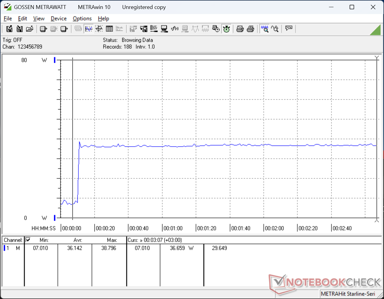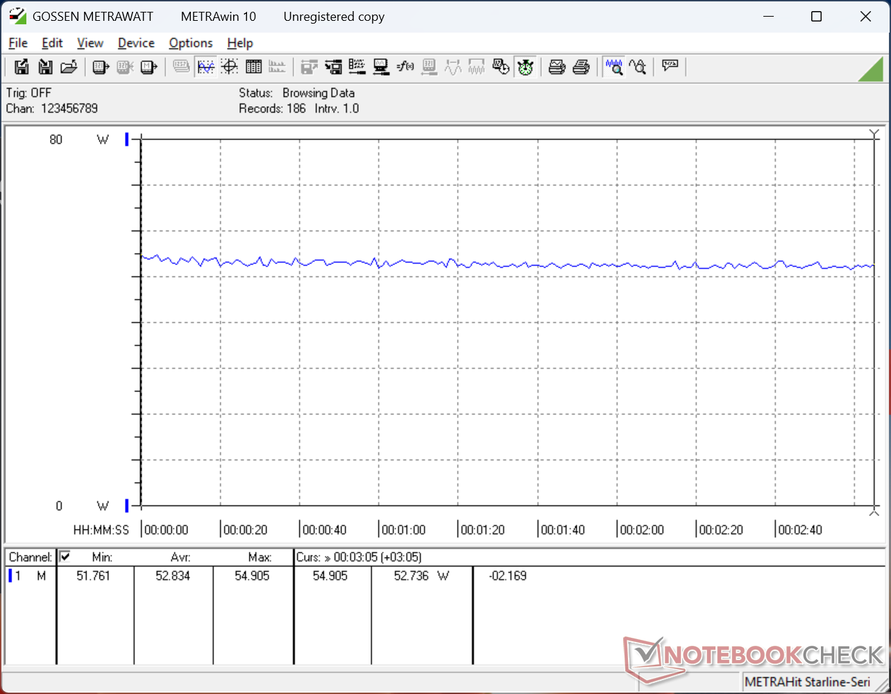 La consommation globale se rapproche de celle du MSI Summit E13 AI Evo équipé d'un Core Ultra H, tout en offrant des performances processeur plus rapides et des performances graphiques similaires. Notez que la consommation baisse régulièrement de 48 W à 35 W en mode ralenti sur Cyberpunk 2077, ce qui suggère un ralentissement des performances au fil du temps, ce qui complète le ralentissement des taux d'images enregistré dans la section Performance du GPU ci-dessus.