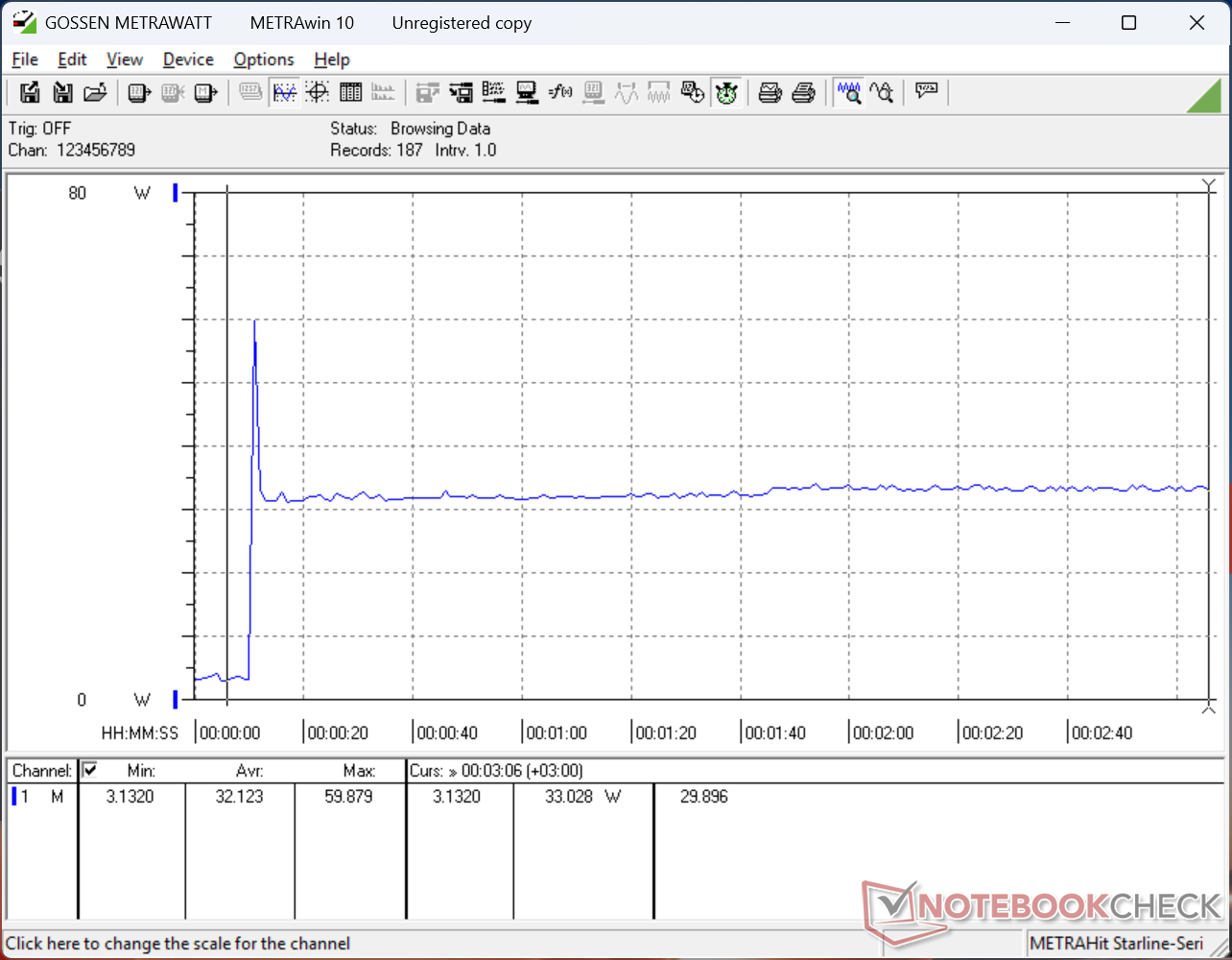Nous avons pu enregistrer une consommation temporaire maximale de 60 W à partir du petit (~8,8 x 4,9 x 2,8 cm) adaptateur secteur USB-C de 65 W lorsque le CPU est pleinement sollicité.