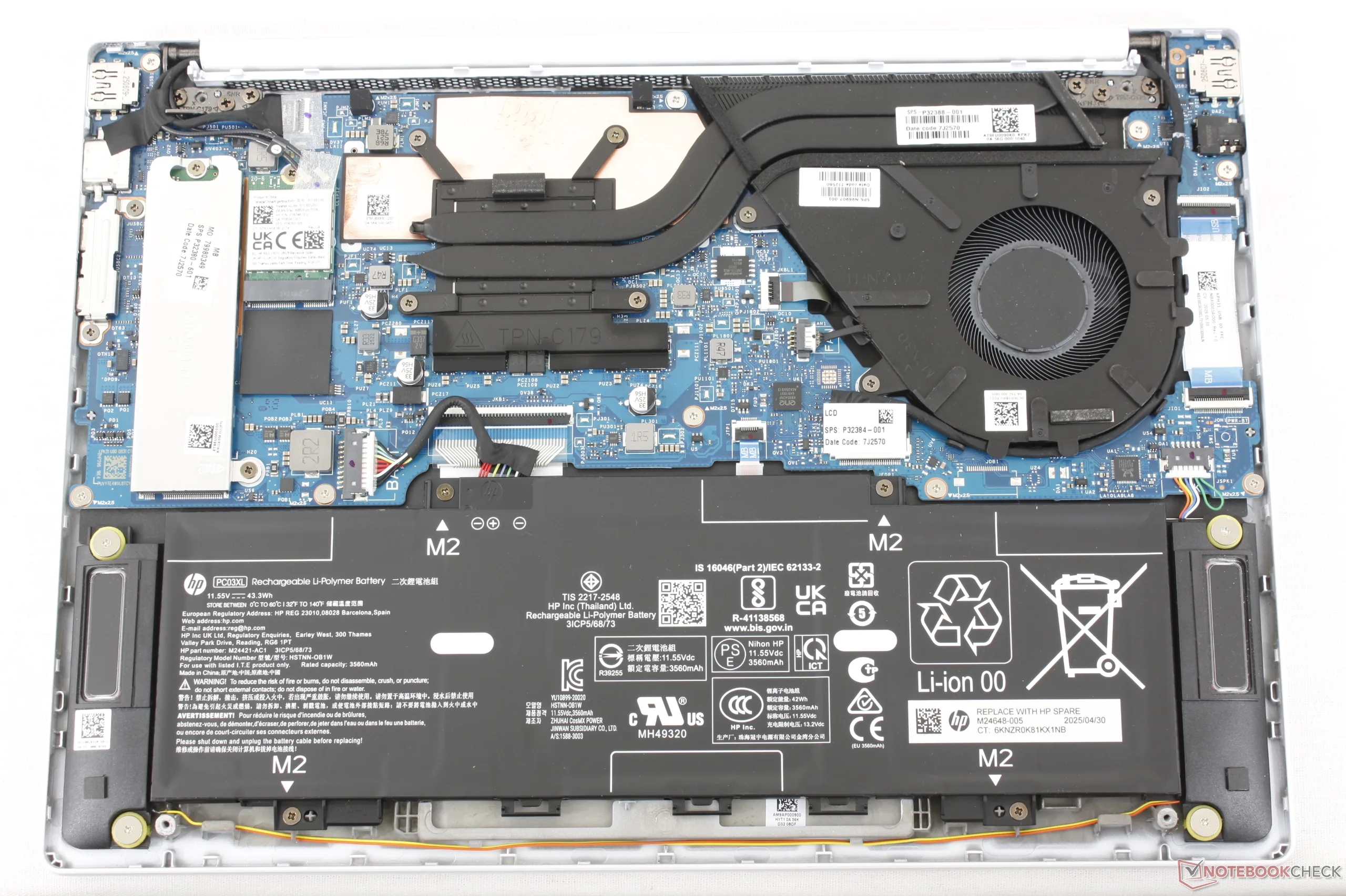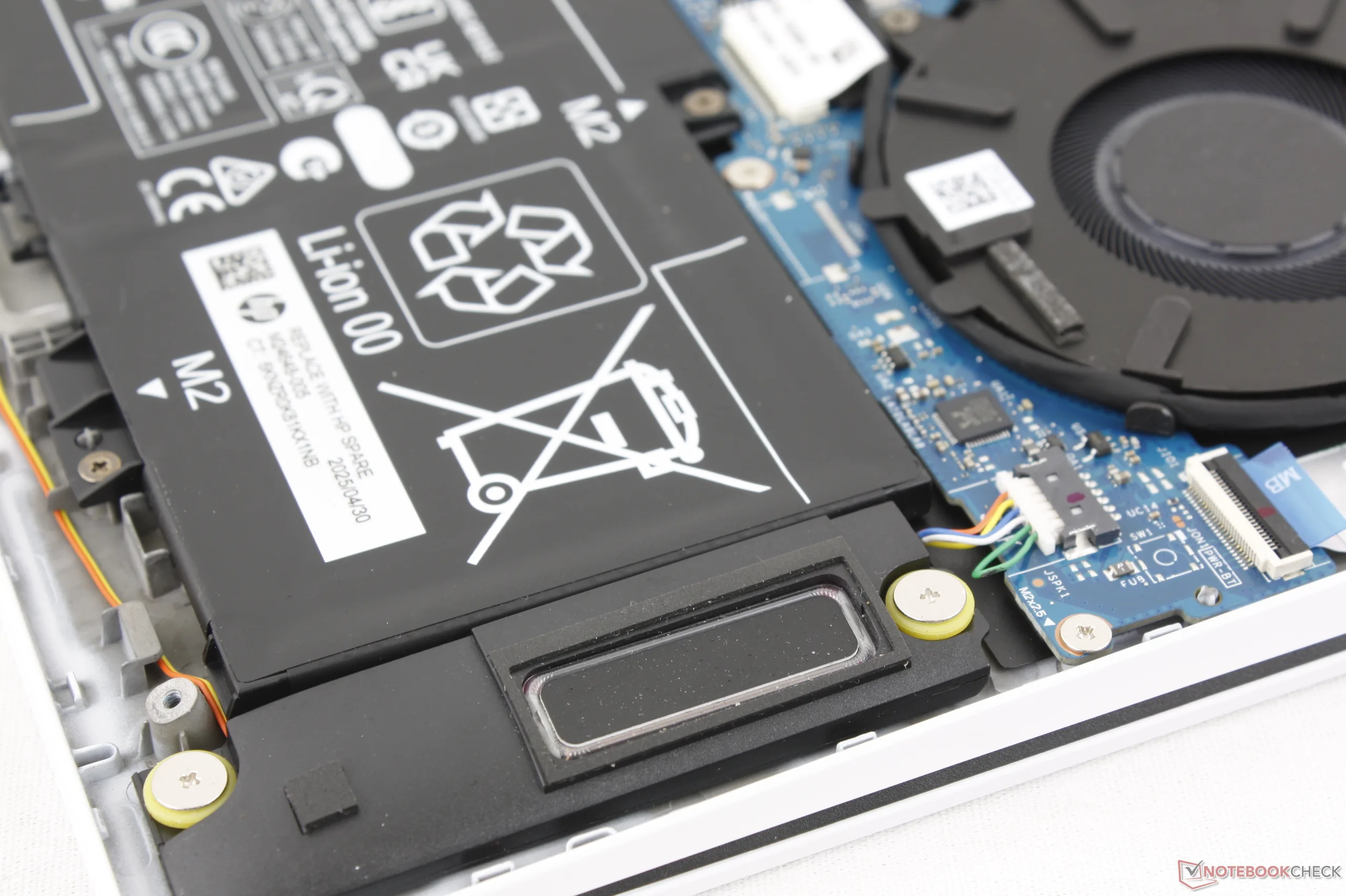 La capacité de la batterie est faible, même pour un 13 pouces, avec seulement 43 Wh. Les MSI Summit E13 et Asus ZenBook S13par exemple, ont des batteries plus importantes de 70 Wh et 63 Wh, respectivement. La plus petite capacité de l'OmniBook Aero est clairement destinée à réduire le poids de l'appareil.