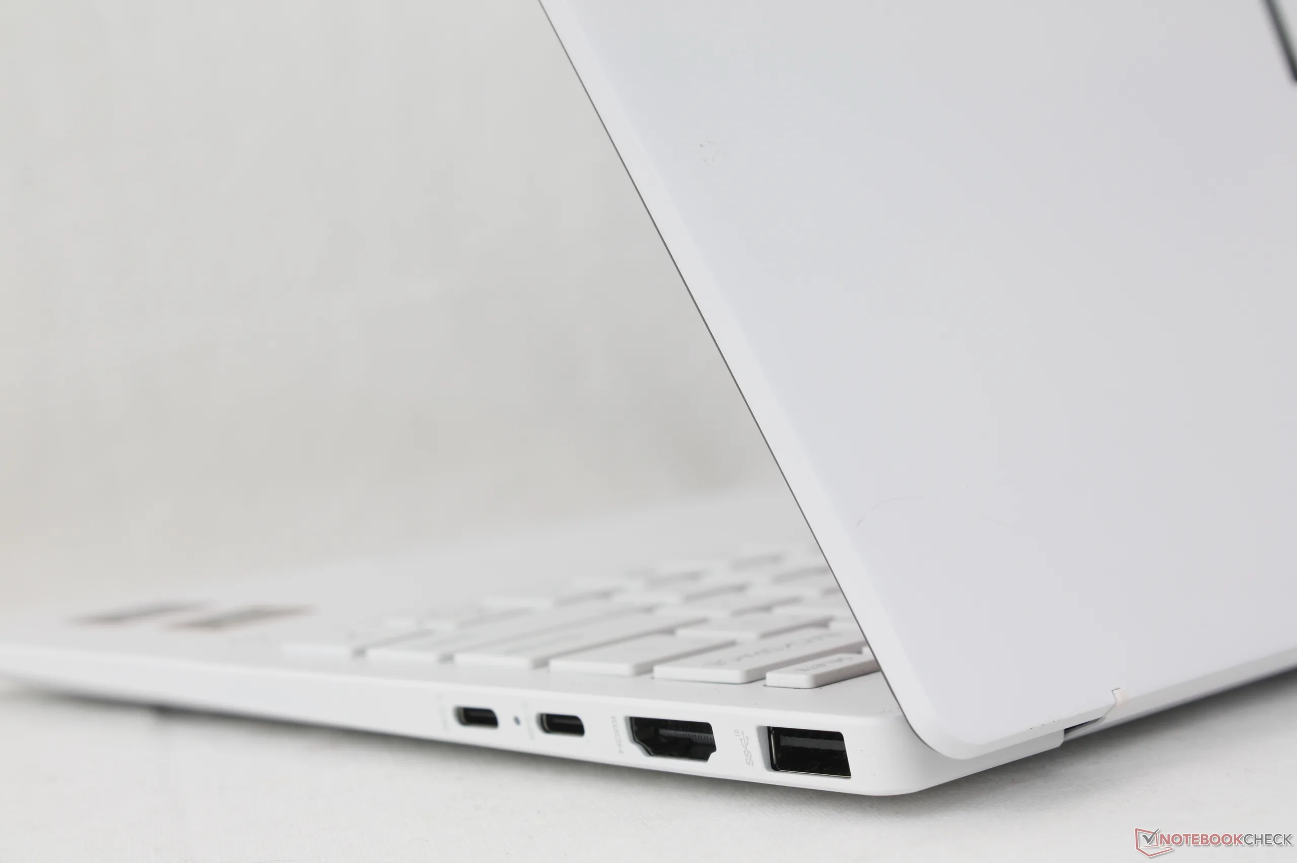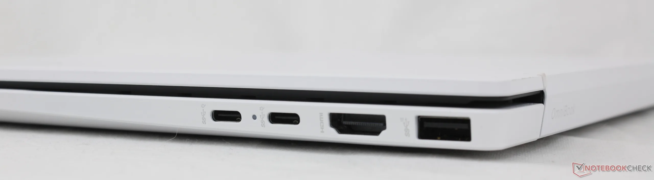 Les ports intégrés sont assez nombreux malgré le poids très faible de l'appareil. En fait, le HP offre plus de ports que le ZenBook S13. Le seul inconvénient est que les ports USB-C ne sont pas compatibles avec Thunderbolt, de sorte que les capacités d'ancrage de l'OmniBook 7 Aero 13 ne sont pas aussi fortes que celles de la plupart des ultrabooks alimentés par Intel.