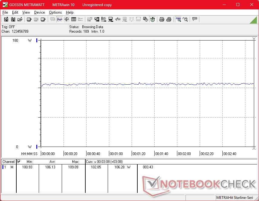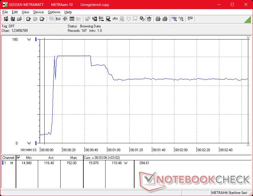 Nous avons pu mesurer une consommation maximale temporaire de 153 W sur le petit adaptateur secteur de 150 W (~13,8 x 6,5 x 2,2 cm) lorsque le CPU et le GPU sont pleinement sollicités.
