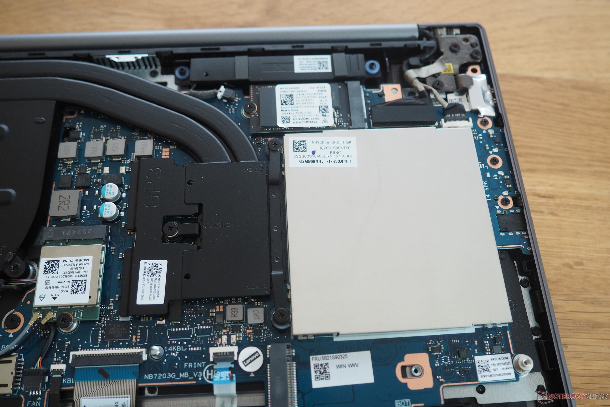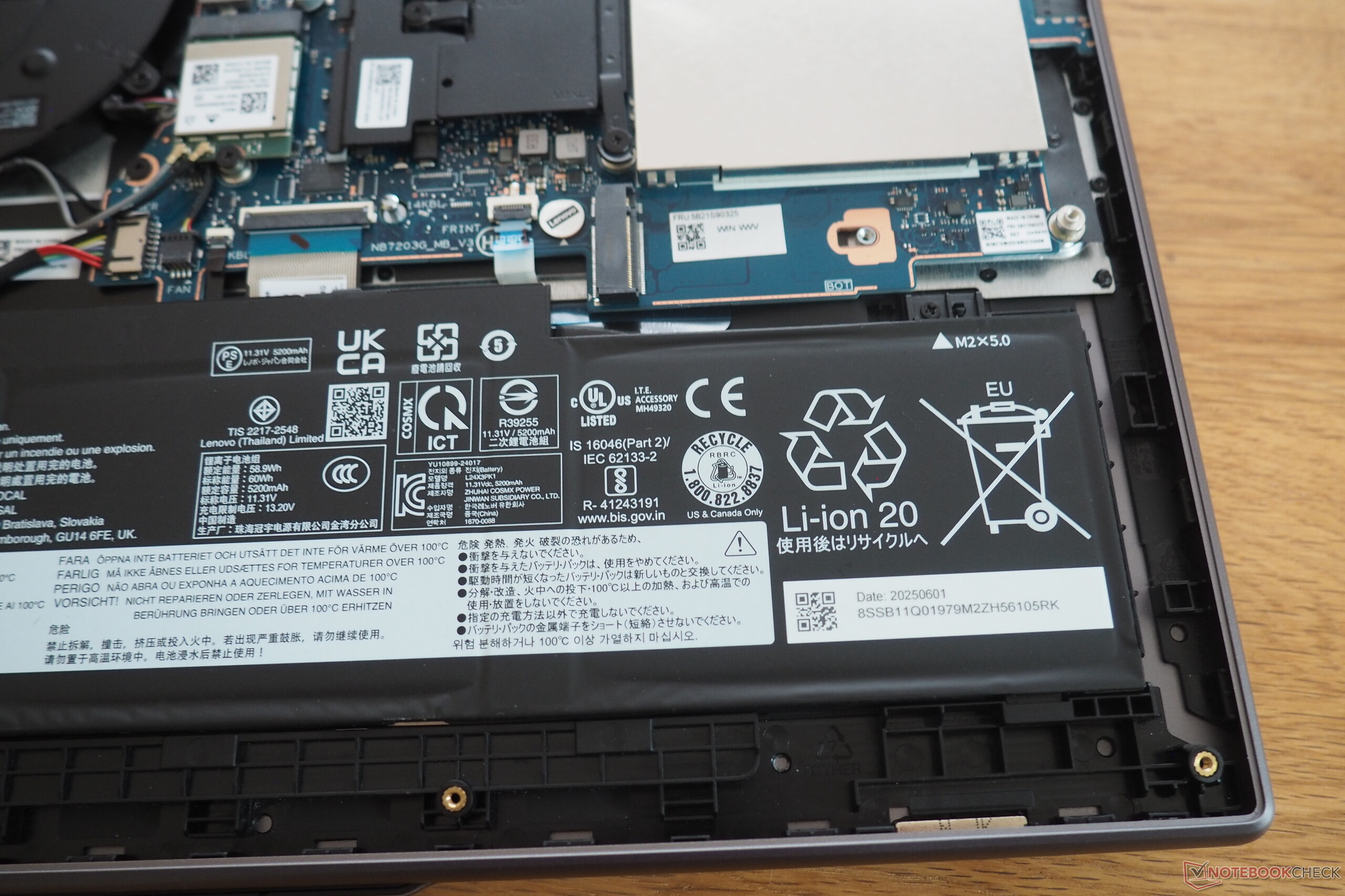Sur le côté gauche, vous trouverez deux ports USB-C 3.1 Gen 2 avec prise en charge DisplayPort 1.4 et PowerDelivery, ainsi qu'une sortie HDMI et une prise audio combinée. Le côté droit abrite un lecteur de carte microSD raisonnablement rapide et deux ports USB-A 3.0 conventionnels. Il n'y a pas de port Ethernet, mais l'ordinateur portable est équipé d'un module Wi-Fi 7 très rapide. La webcam, qui comprend un obturateur de confidentialité, n'offre qu'une résolution de 0,9 MP, mais produit une image plus nette que de nombreux modèles concurrents. Le capot inférieur s'enlève facilement après avoir dévissé six vis Torx. À l'intérieur, vous trouverez deux emplacements SO-DIMM occupés ainsi que deux emplacements M.2. L'emplacement 2280 est libre, tandis que le SSD installé se trouve dans l'emplacement 2242, plus petit.