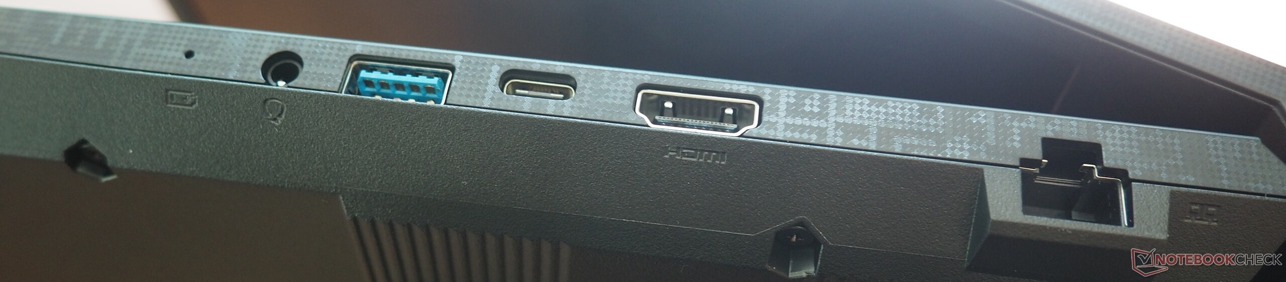 Le Katana 17 offre trois ports USB-A (3.0) et un port USB-C (3.1 Gen 2 avec DisplayPort) ainsi qu'une prise audio, un port Gigabit Ethernet et une sortie HDMI 2.1. La vitesse du module Wi-Fi intégré (Intel Wi-Fi 6E AX211) est décente à très bonne, selon le test. Toutefois, la webcam HD offre une image très floue.