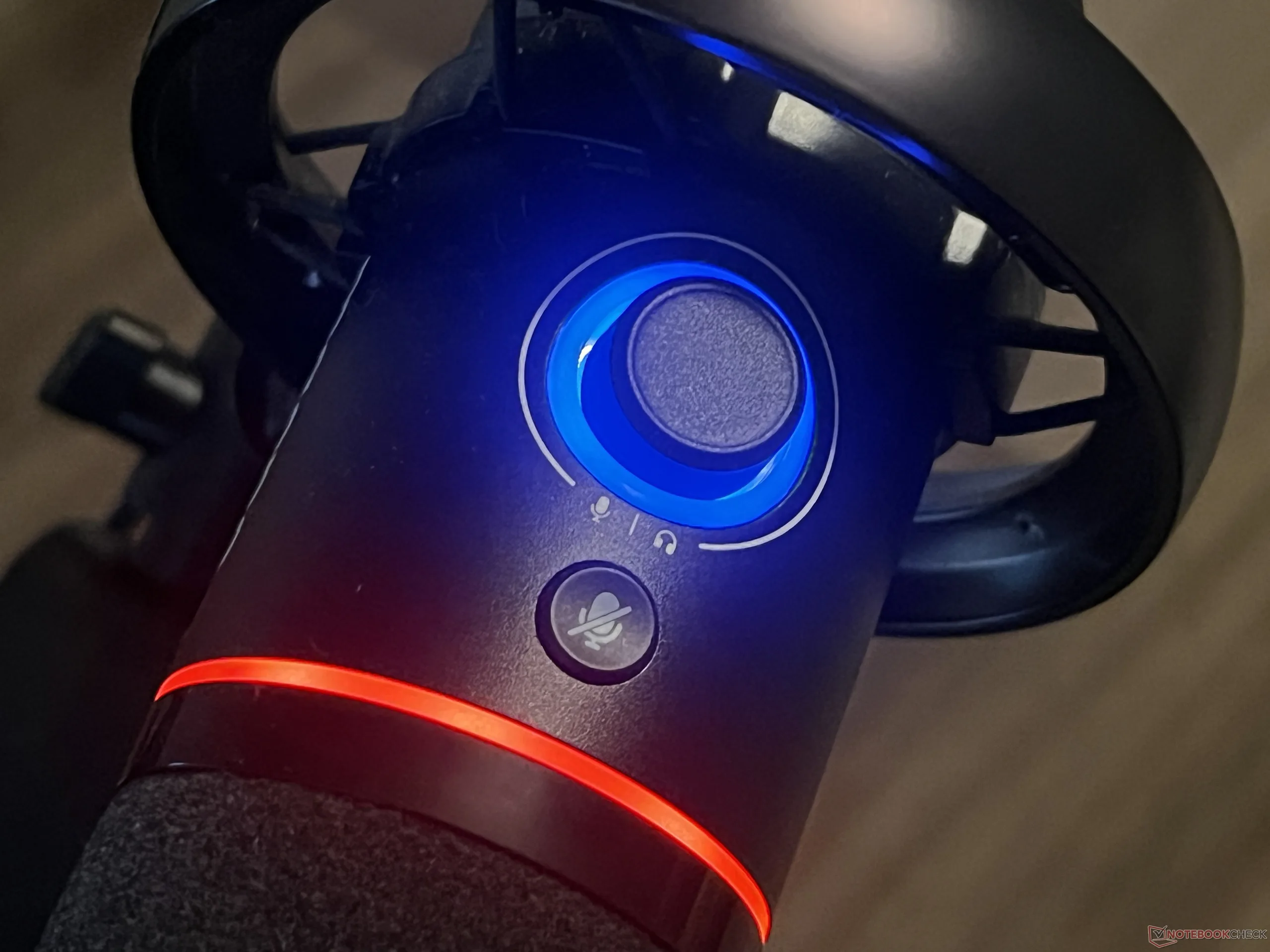 Sur le corps principal du microphone se trouve un bouton unique qui contrôle soit le gain (le volume entrant dans le microphone), soit le volume du casque (sortant via la prise jack 3,5 mm située sur la partie inférieure du corps du microphone). Cette lampe est entourée d'un anneau de DEL qui donne une vague idée de l'endroit où sont réglés les niveaux de gain ou de volume, bien qu'il ne s'agisse pas d'une indication très précise. Le couvercle s'assombrit lorsque le volume diminue et s'éclaircit lorsque le volume augmente, mais il est difficile de savoir exactement à quel pourcentage ou à quel niveau se trouve le volume. Le bouton offre un bon retour tactile, avec un clic à chaque niveau. Pour référence, il y a exactement 20 clics de 0 à 100 %, il faut donc compter les clics pour avoir une idée plus précise. Un repère visuel plus précis serait une meilleure option pour les révisions futures, permettant aux utilisateurs de savoir d'un coup d'œil à quel niveau de gain ils sont réglés.