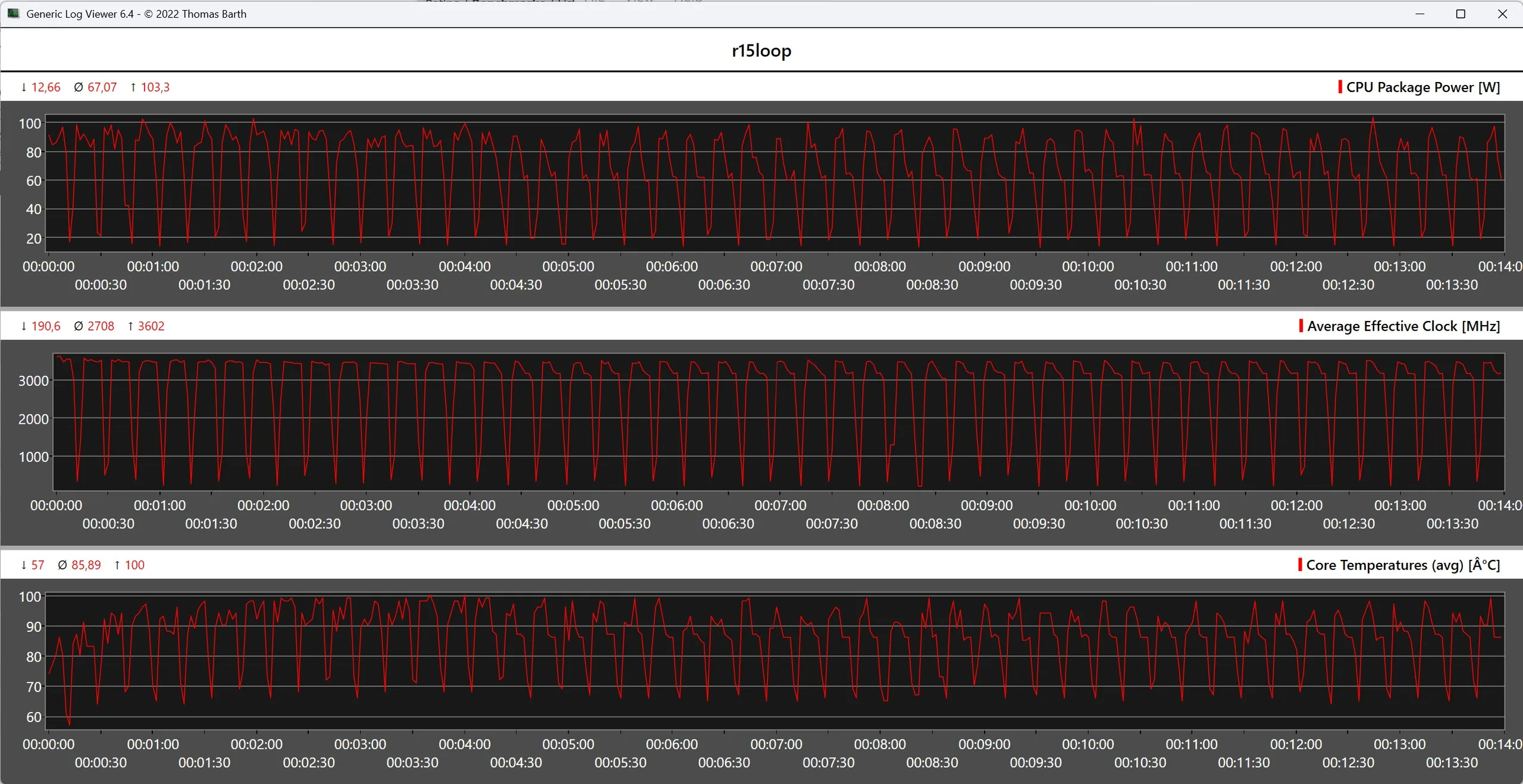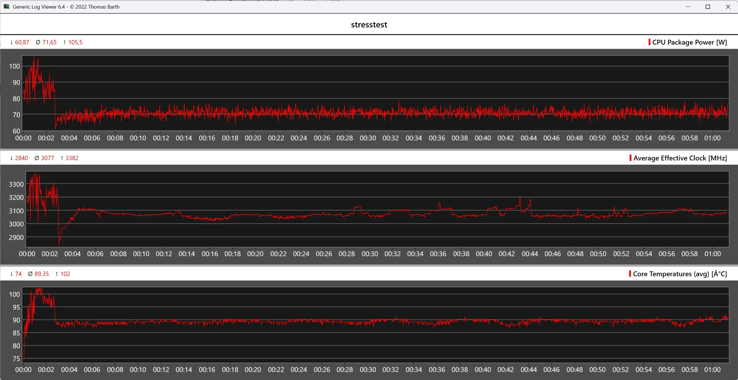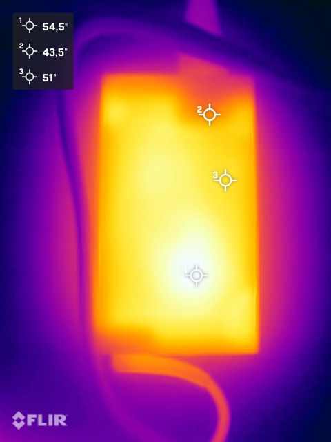 Les températures de surface de l'Asus NUC 15 Pro+ augmentent de manière significative sous charge, mais n'atteignent pas de points chauds critiques grâce à la surface en plastique. L'Intel Core Ultra 9 285H atteint des températures d'environ 100 °C lors du test de stress. La consommation d'énergie à court terme peut atteindre plus de 100 watts, tandis que la charge continue s'établit à environ 71 watts. Ces températures sont conformes aux spécifications, car le processeur est conçu pour une température maximale de 110 °C.