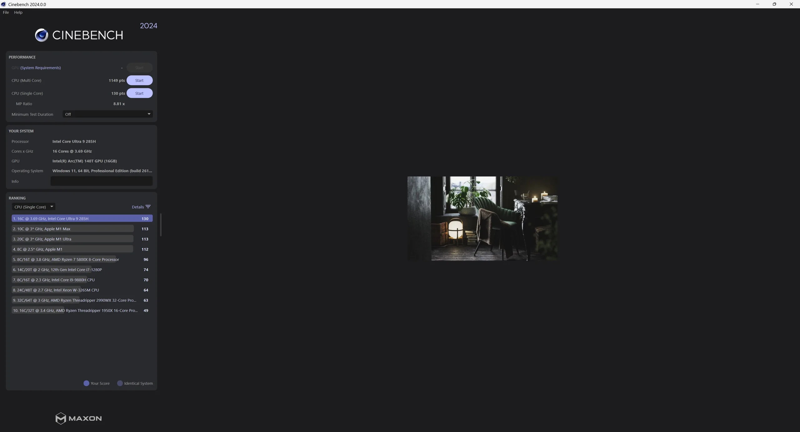 Ultra 9 285H | Asus NUC 15 Pro+ (Nvidia GeForce RTX 4090 @TB4) | Sapphire Edge AI, Ryzen AI 9 HX 370 (Nvidia GeForce RTX 4090 @USB4) Ryzen AI 9 HX 370 | Minisforum AI X1, Ryzen 7 255 (Nvidia GeForce RTX 4090 @OCuLink) | Moyenne de la classe Mini PC | |