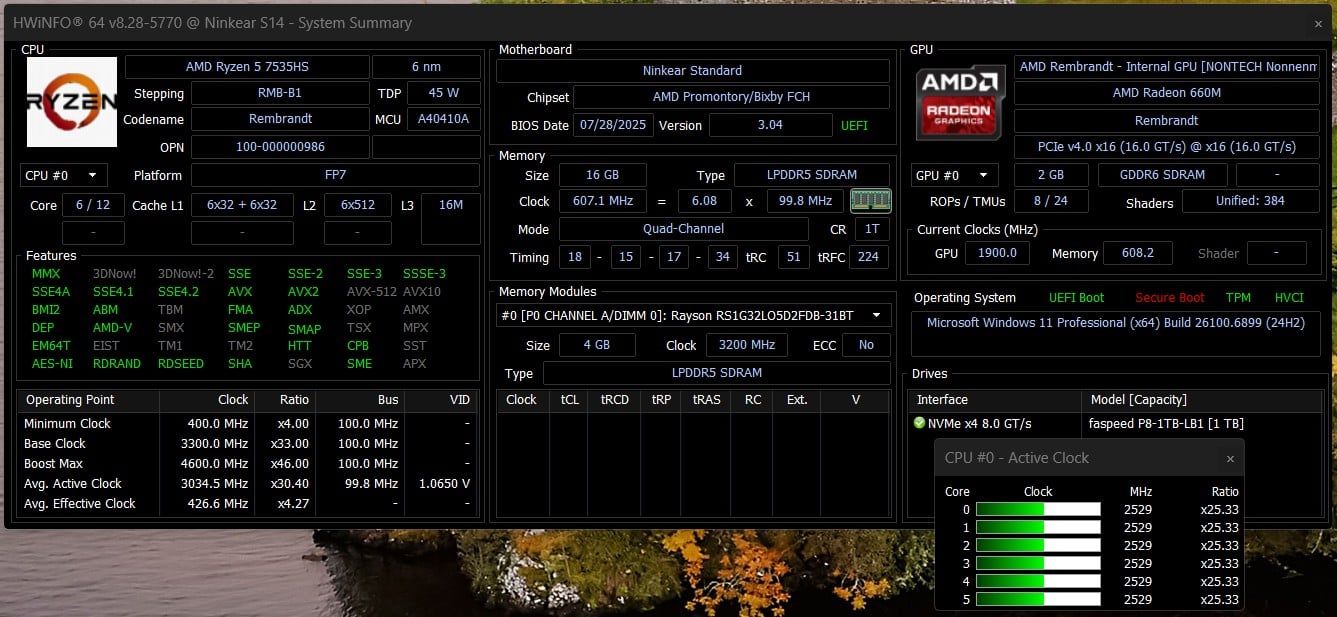 | Ninkear S14, 16+1TB AMD Ryzen 5 7535HS ⎘ AMD Radeon 660M ⎘ 16 Go Mémoire, 1024 Go SSD | Prix de liste: 629€ | 1.1 kg | 15 mm | 14.00" 2240x1400 189 PPI | |