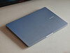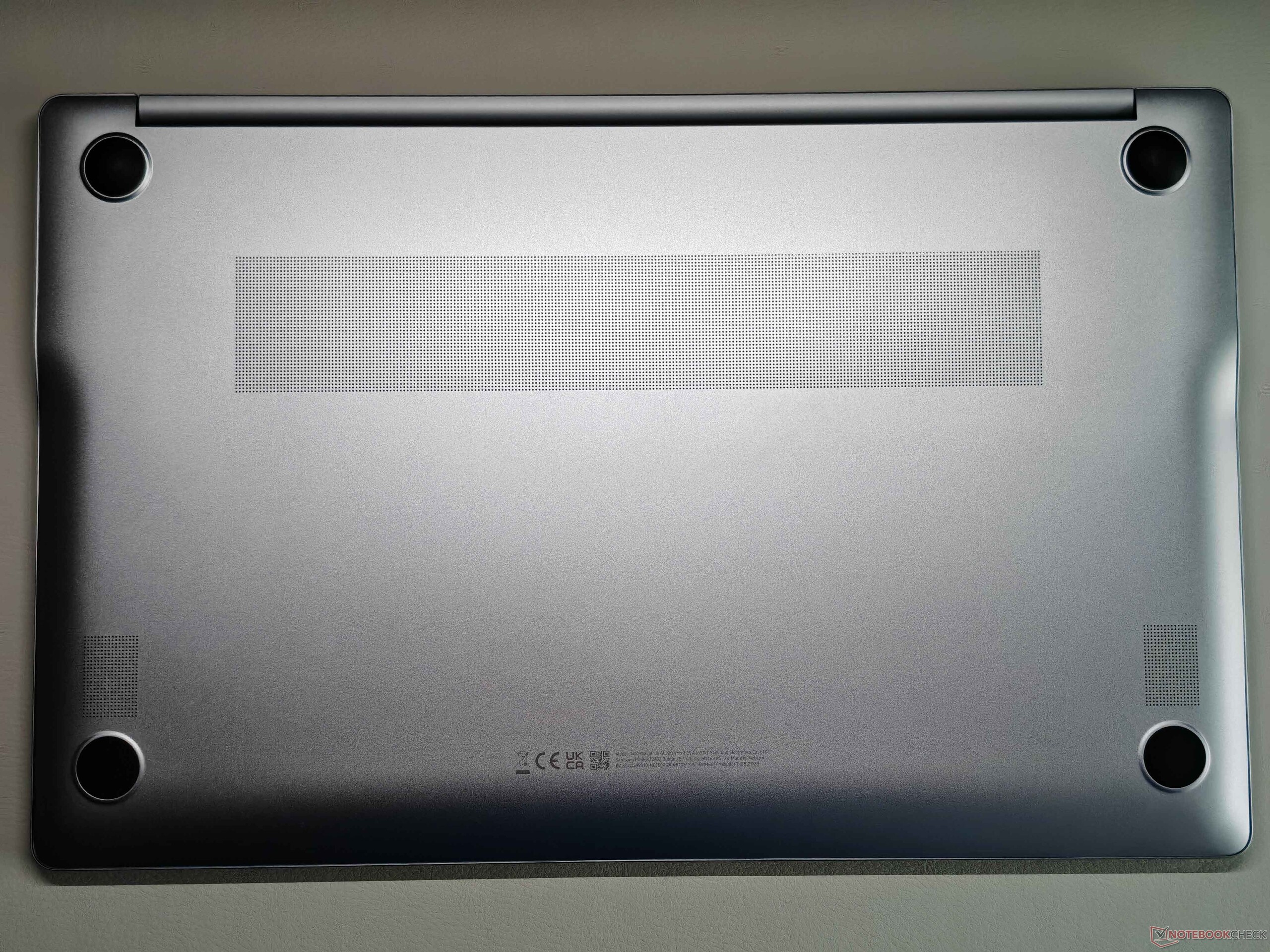 Samsung utilise une fine coque métallique pour le Galaxy Book4 Edge, qui mesure 1,5 cm d'épaisseur et pèse 1,49 kg, ce qui lui permet de se glisser facilement dans n'importe quel sac à dos. La couleur du boîtier est le bleu saphir, qui est une nuance de bleu très légère (plutôt argent avec une légère teinte bleue). Visuellement, l'ordinateur portable a fière allure, et la qualité est également bonne. Seule la charnière de l'écran (angle d'ouverture maximal de 180 degrés) est un peu trop lisse et oscille donc un peu. Le couvercle du boîtier inférieur est amovible (vis sous les pieds en caoutchouc), mais les possibilités d'entretien se limitent au nettoyage du ventilateur, du module WLAN et de la batterie, qui peut être remplacée si nécessaire.