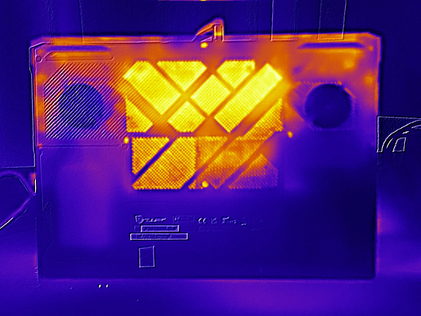 Les températures de surface restent raisonnables dans les charges de travail 3D, la partie supérieure atteignant un maximum de 40 °C. Cependant, la partie inférieure peut chauffer jusqu'à 47 °C. Au repos, le châssis se maintient à une température modérée de 24 à 35 °C.