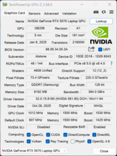 | Schenker XMG FUSION 16 (M25) Ultra 9 275HX, GeForce RTX 5070 Laptop, Samsung 9100 Pro 2 TB, OLED, 2880x1800, 16" | Lenovo Legion Pro 5 16IAX10, RTX 5070 Ultra 7 255HX, GeForce RTX 5070 Laptop, SK Hynix HFS001TEJ9X115N, OLED, 2650x1600, 16" | Schenker XMG Core 16 M25 Ryzen AI 9 HX 370, GeForce RTX 5070 Laptop, Samsung 990 Pro 2 TB MZVL72T0HDLB, IPS, 2560x1600, 16" | Asus TUF Gaming A16 FA608UP R7 260, GeForce RTX 5070 Laptop, Western Digital PC SN5000S SDEQNSJ-1T00, IPS, 2560x1600, 16" | MSI Crosshair 16 HX AI D2XWGKG Ultra 9 275HX, GeForce RTX 5070 Laptop, Micron 2500 1TB MTFDKBA1T0QGN, IPS, 2560x1600, 16" | Aorus Elite 16 AE6H Ultra 9 275HX, GeForce RTX 5070 Laptop, Gigabyte AG470S1TB-SI B10, IPS, 2560x1600, 16" | Gigabyte Gaming A16 GA6H i7-13620H, GeForce RTX 5070 Laptop, Kingston OM8PGP41024Q-A0, IPS, 2560x1600, 16" | Moyenne NVIDIA GeForce RTX 5070 Laptop | Moyenne de la classe Gaming | |