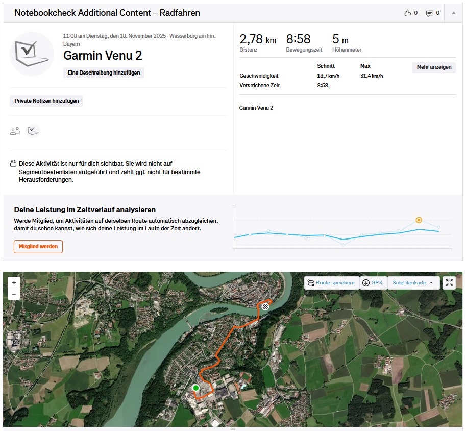 Nous avons voulu tester le positionnement en situation réelle lors d'une sortie à vélo. Nous avons également utilisé la Garmin Venu 2, une montre intelligente dotée d'un système de positionnement très précis.