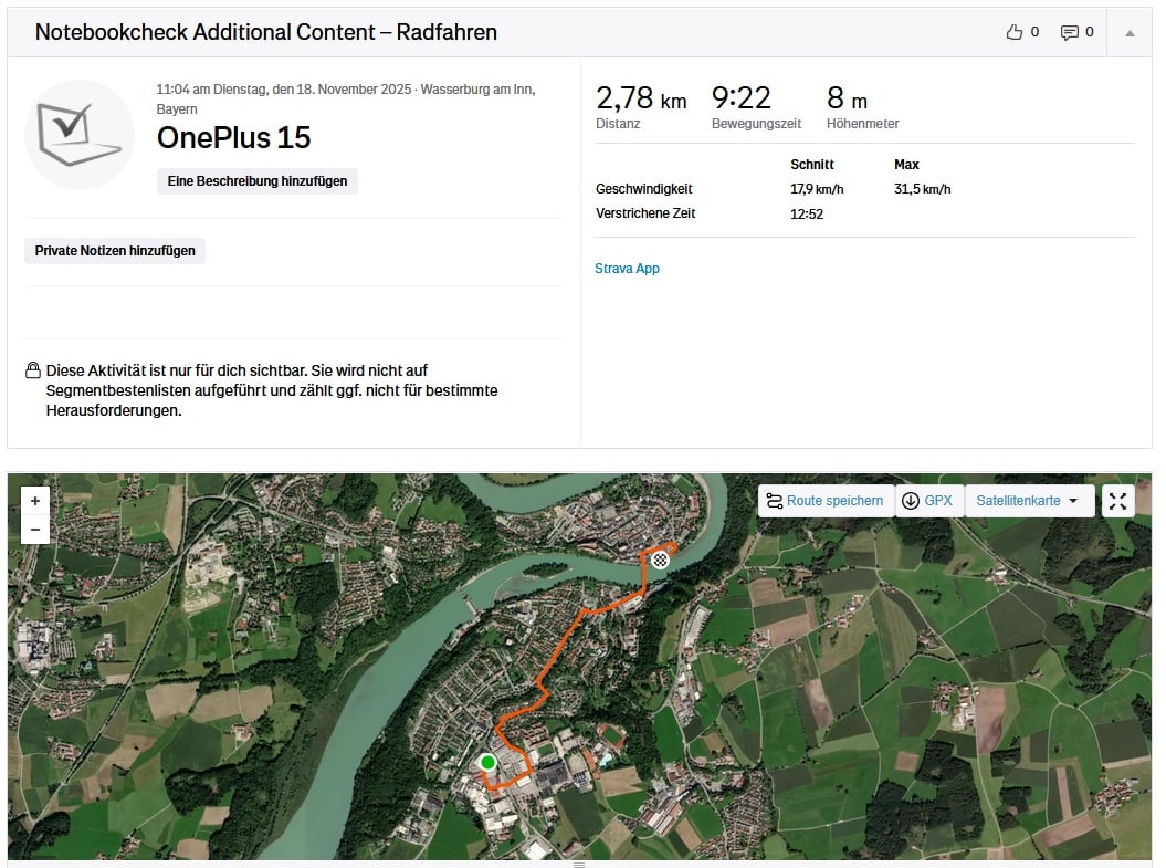 Les deux appareils ont calculé exactement la même distance, et le OnePlus 15 a représenté notre itinéraire avec précision. Sur le pont, nous avons été placés à quelques mètres de notre chemin réel, mais dans l'ensemble, le téléphone est très bien adapté à la navigation et au suivi de la localisation.