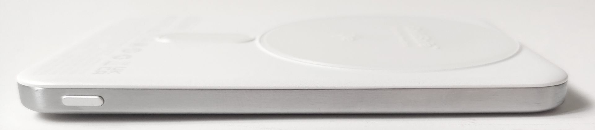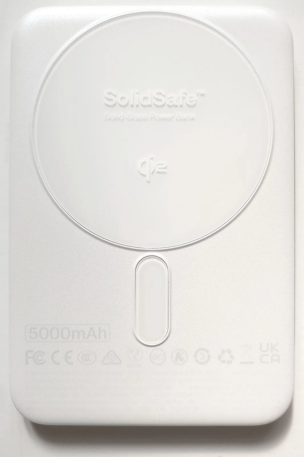 Le socle de recharge magnétique Qi2 est situé sur le fond en plastique, de couleur blanc nacré. Le socle circulaire dépasse d'environ 0,5 mm, de sorte que le power bank se balance légèrement lorsqu'il est placé sur une surface plane, le couvercle métallique vers le haut, et que la zone autour du logo est pressée vers le bas.